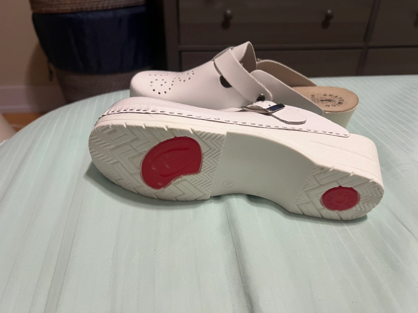 White leather clogs with a buckle strap. Perforated leather design. They are on a platform base.Red dots are for spine prior points comfort