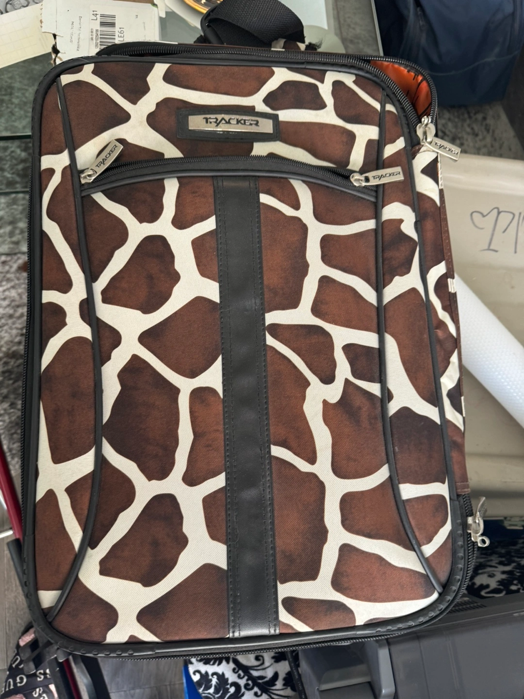 Giraffe print rolling luggage with two wheels. It has a handle and two compartments, one of which features a zippered pouch and mesh pockets.