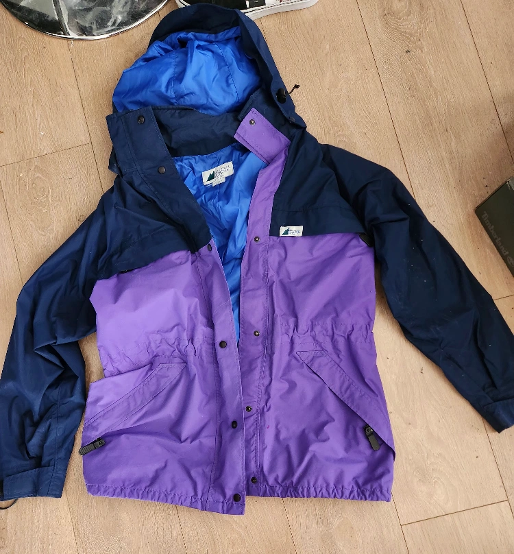 Mountain Equipment Co-op Large size Gore-Tex jacket. Blue, purple, and black.