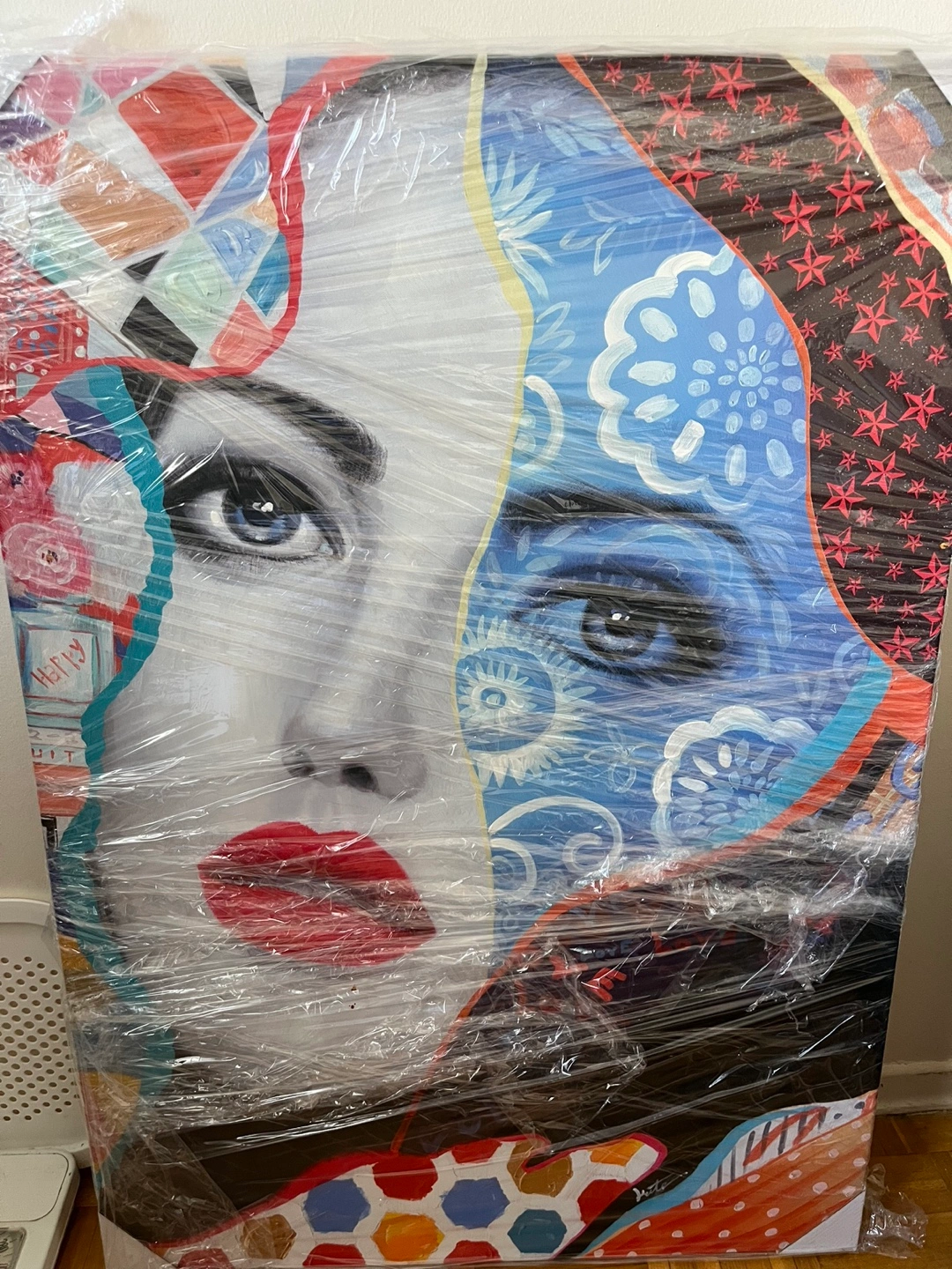 Large canvas wall art featuring an abstract woman with colourful patterns. Wrapped and ready to hang.