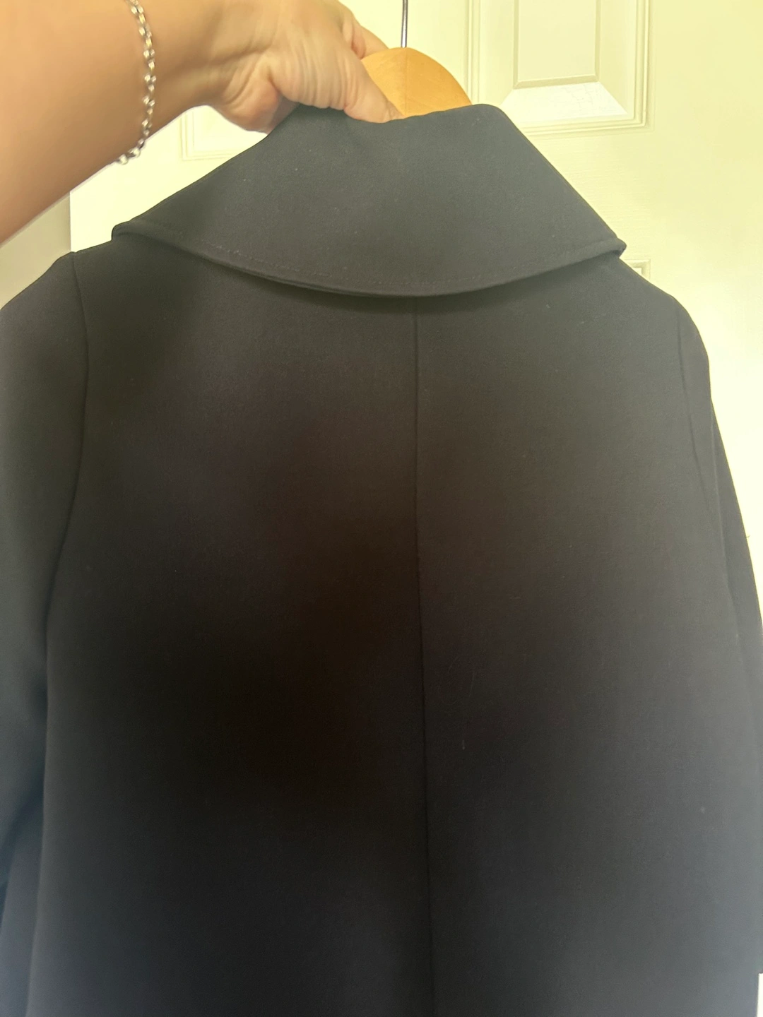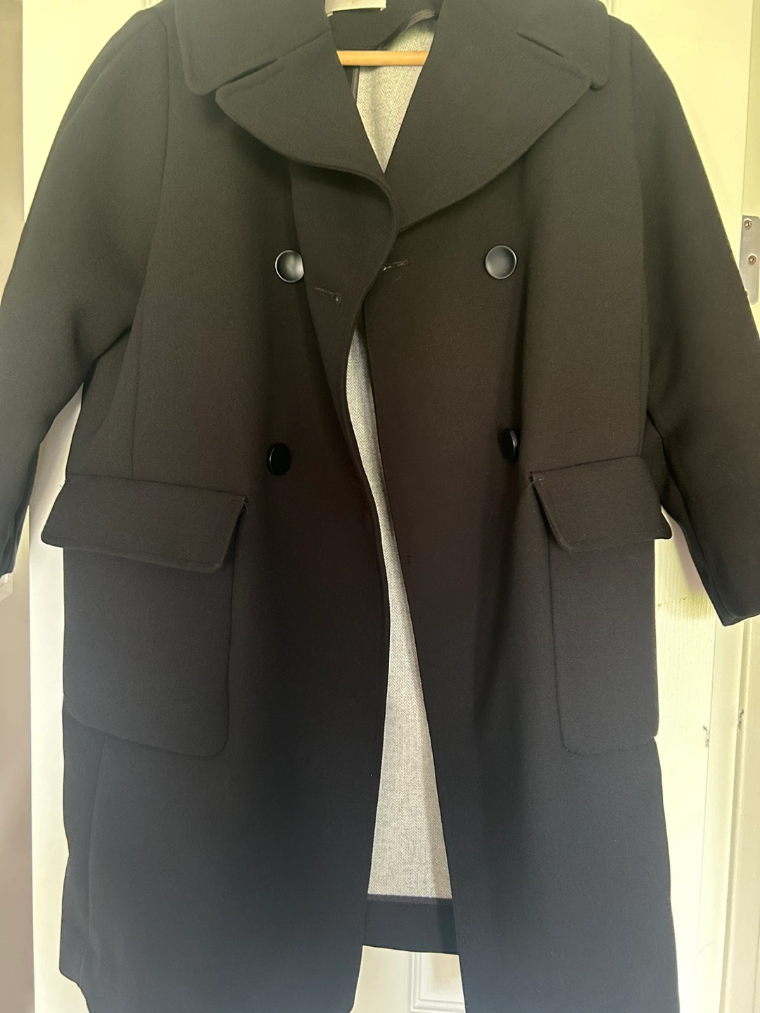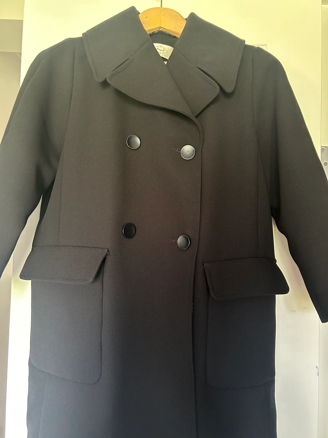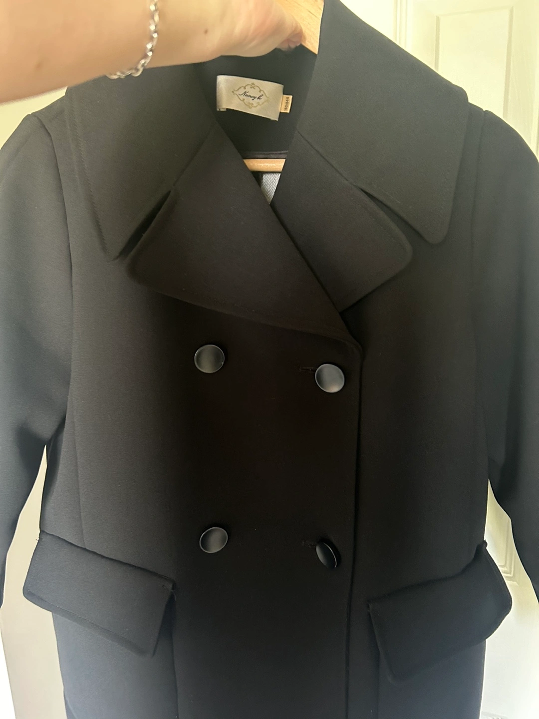 1000+Black double breasted coat with pockets. Long sleeves. Classic style. 7/8 sleeves