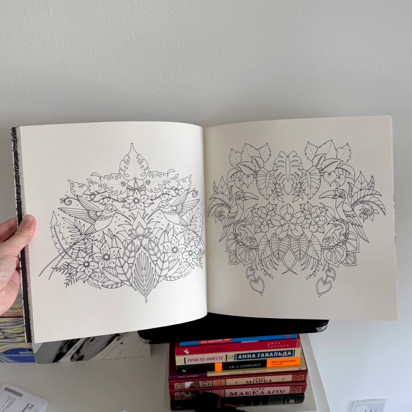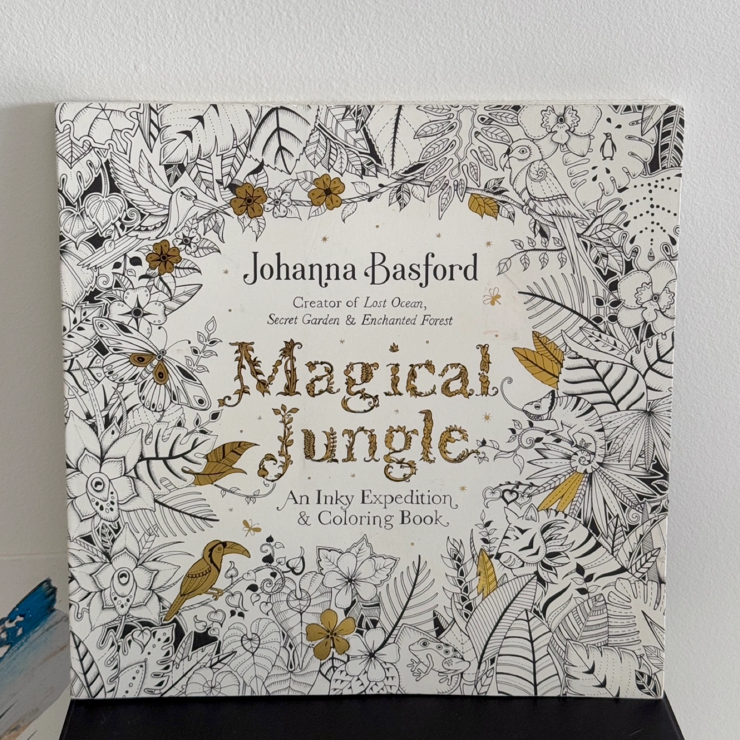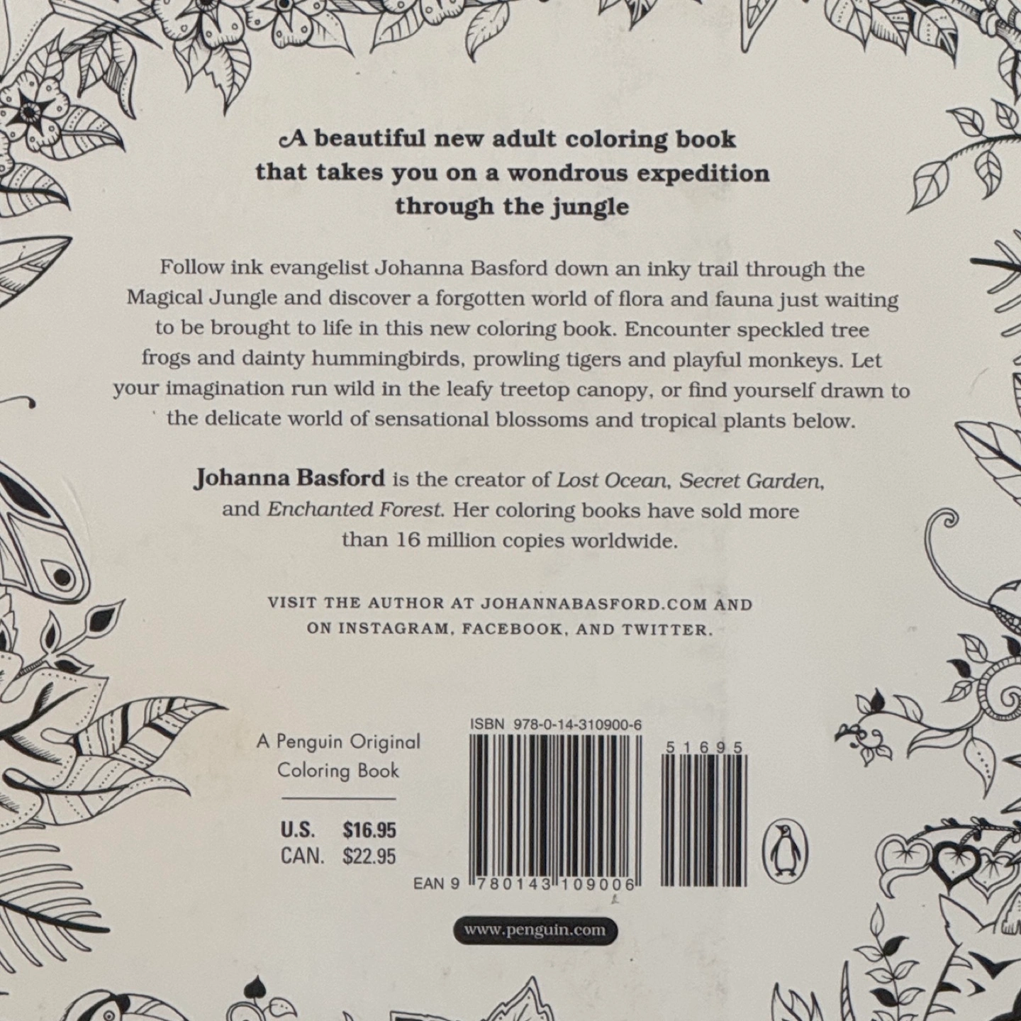 327Adult coloring book featuring intricate drawings of jungle flora and fauna. Includes pages with birds, flowers, and toucans. Never used, I just decided to clean up my space.
