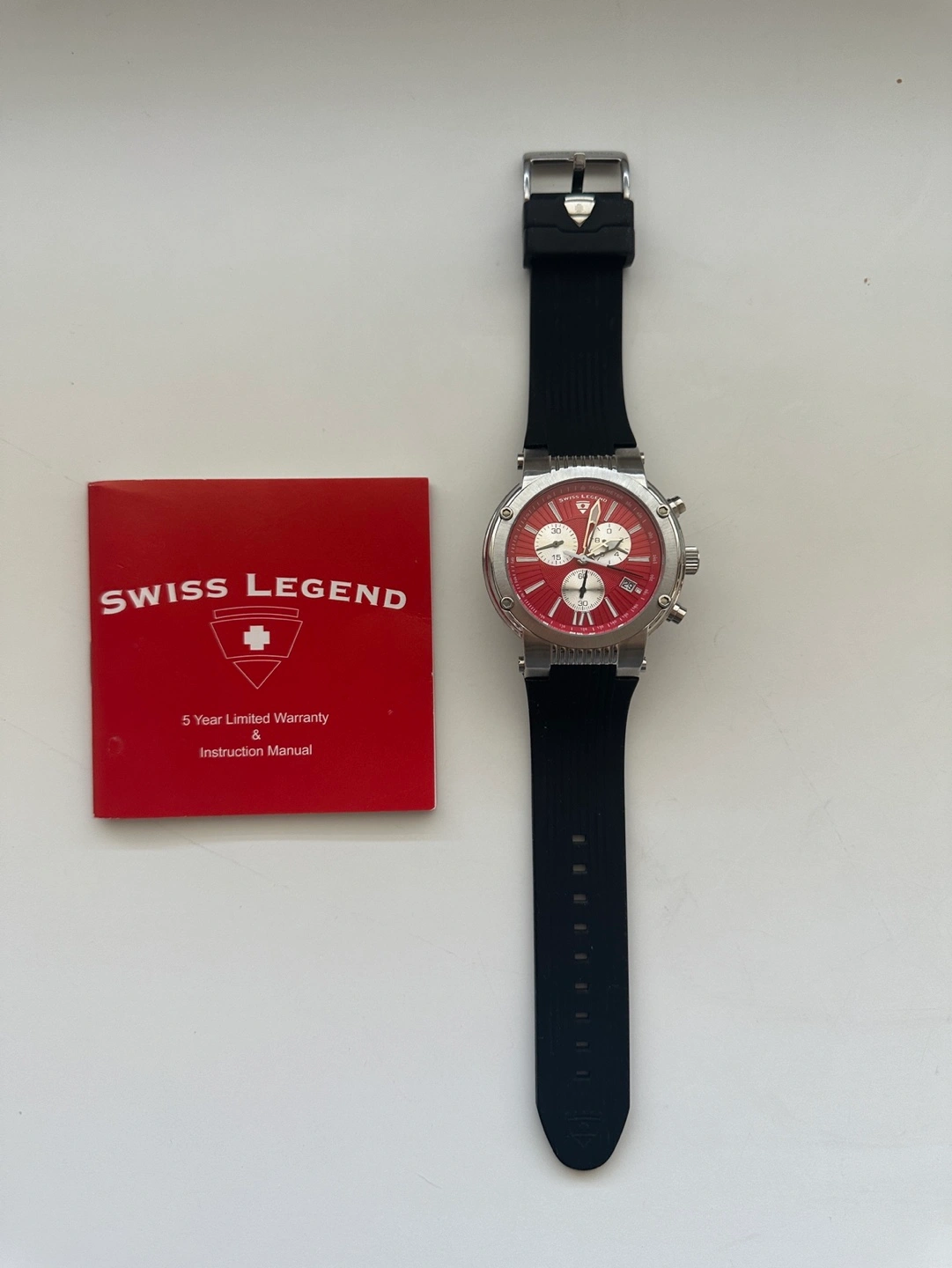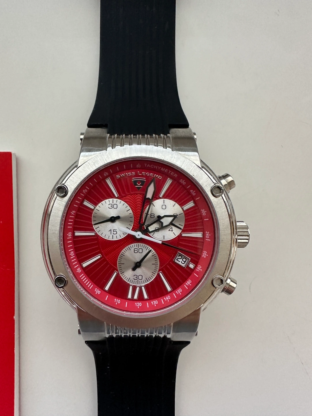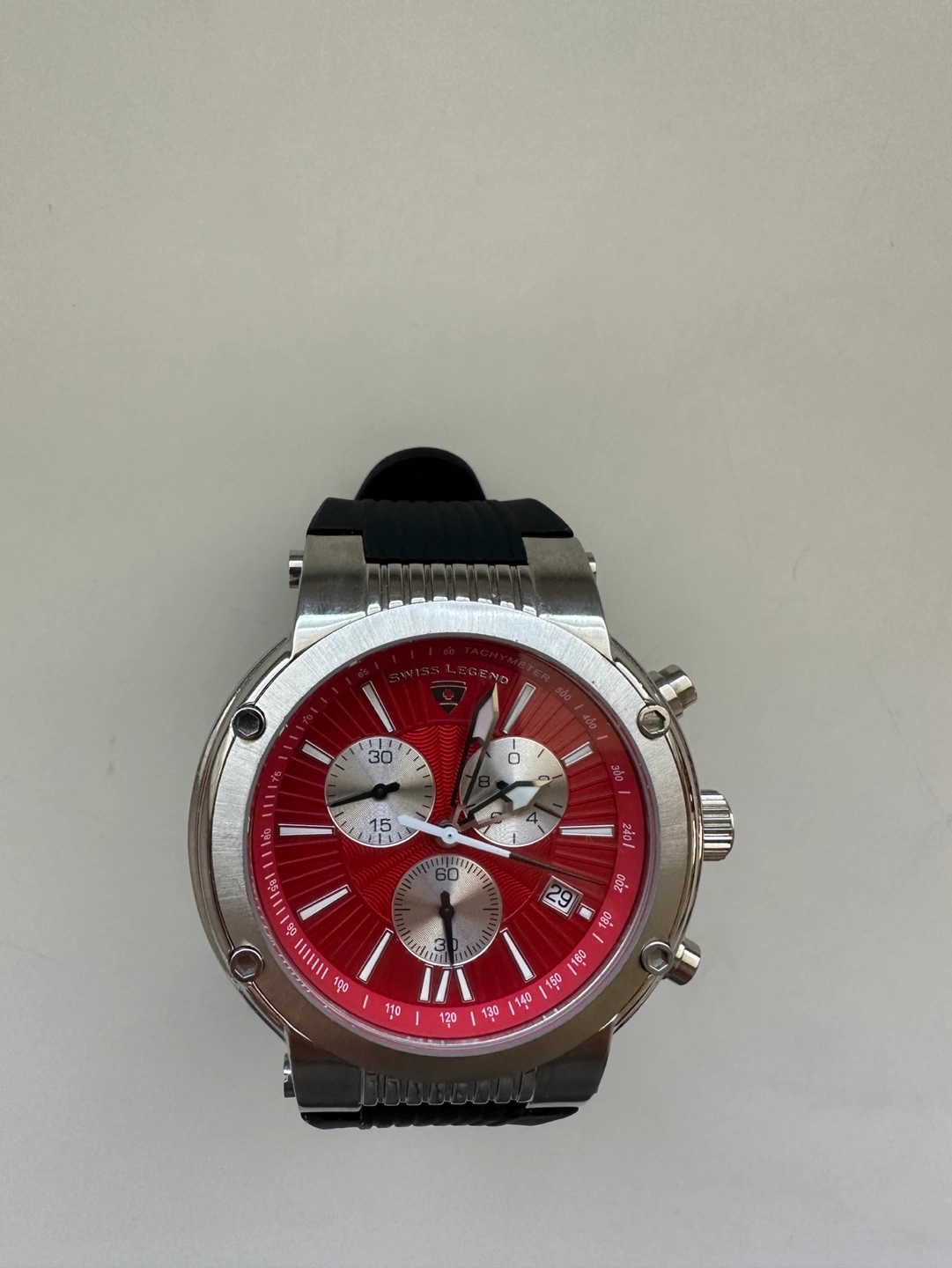 258Excellent condition. Has battery. Material & Measurements Model: SL-10006-05 Manufacturer: Swiss Legend Series: Legato Cirque Type: Men's watch, Dress / Sport Diameter: Ø 48.00 mm Thickness: 14.00 mm Case: Brushed/polished steel Back case rear: Solid Bracelet: Black rubber Dial: Red with luminescent markers roman numerals and index markings, luminescent hands Buckle: Tang type buckle made of steel Glass: Mineral, shatter-resistant Bezel: Steel, brushed/polished Movement & Functions Movement type: Quartz (battery powered) Seconds hand: Ticking Water protection: 10 ATM Functions: - Tachometer - Separate seconds dial - Chronograph
