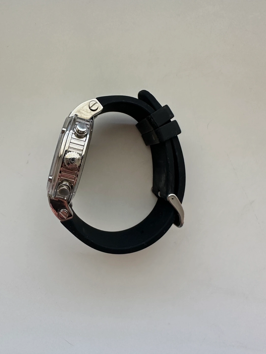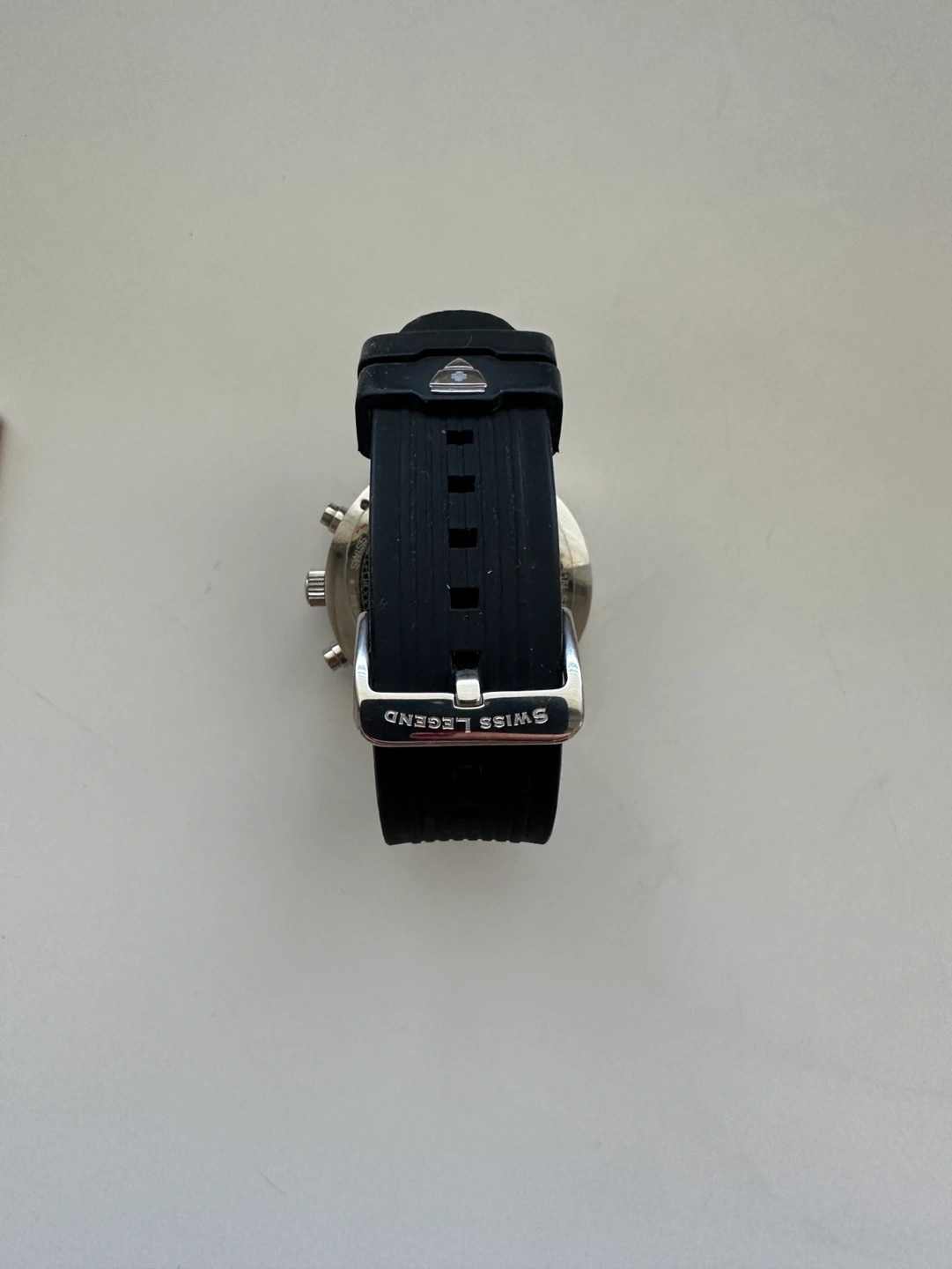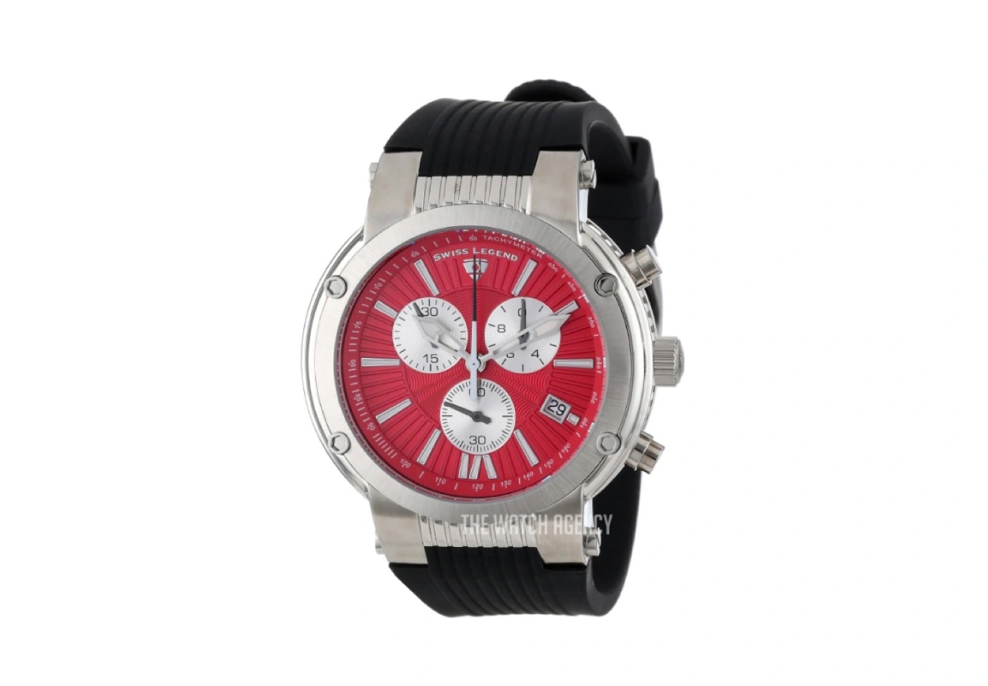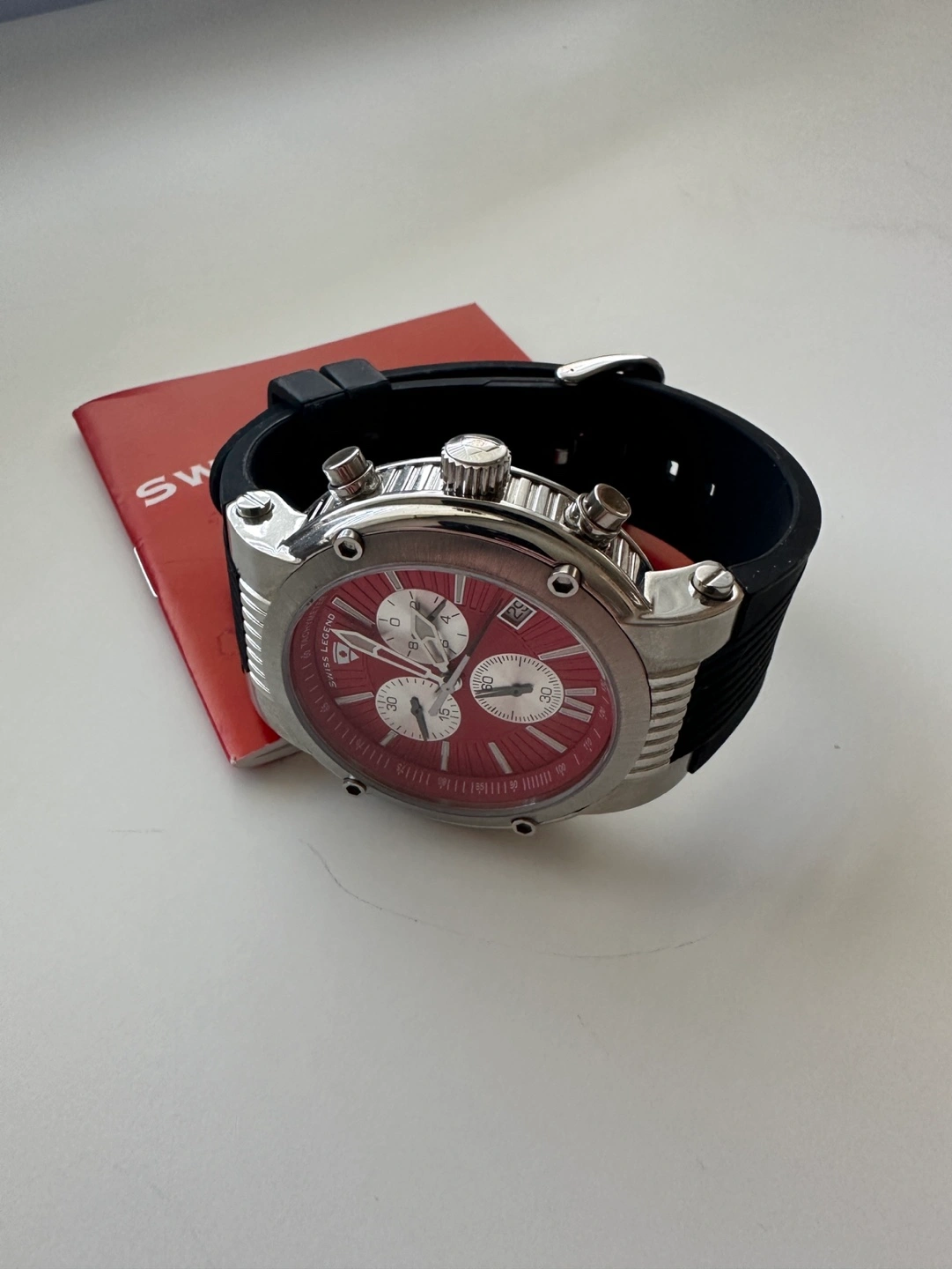 258Excellent condition. Has battery. Material & Measurements Model: SL-10006-05 Manufacturer: Swiss Legend Series: Legato Cirque Type: Men's watch, Dress / Sport Diameter: Ø 48.00 mm Thickness: 14.00 mm Case: Brushed/polished steel Back case rear: Solid Bracelet: Black rubber Dial: Red with luminescent markers roman numerals and index markings, luminescent hands Buckle: Tang type buckle made of steel Glass: Mineral, shatter-resistant Bezel: Steel, brushed/polished Movement & Functions Movement type: Quartz (battery powered) Seconds hand: Ticking Water protection: 10 ATM Functions: - Tachometer - Separate seconds dial - Chronograph