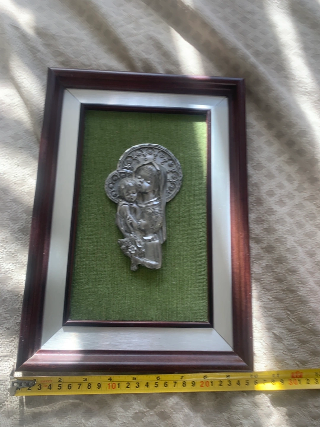 Italian hand carved pewter wood framed holy family wall hanging