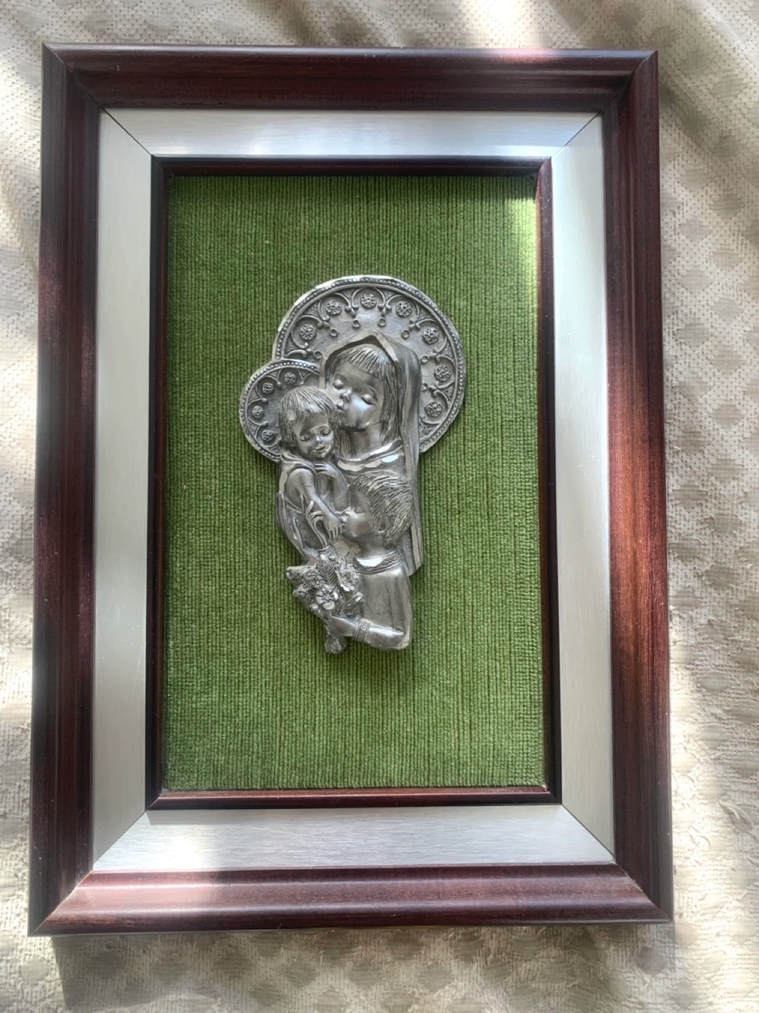 Vintage Peltro Inciso, hand carved pewter religious depiction on soft textured green fabrics - in dark wood frame. In great condition. Hand made in Italy. Giftable.
