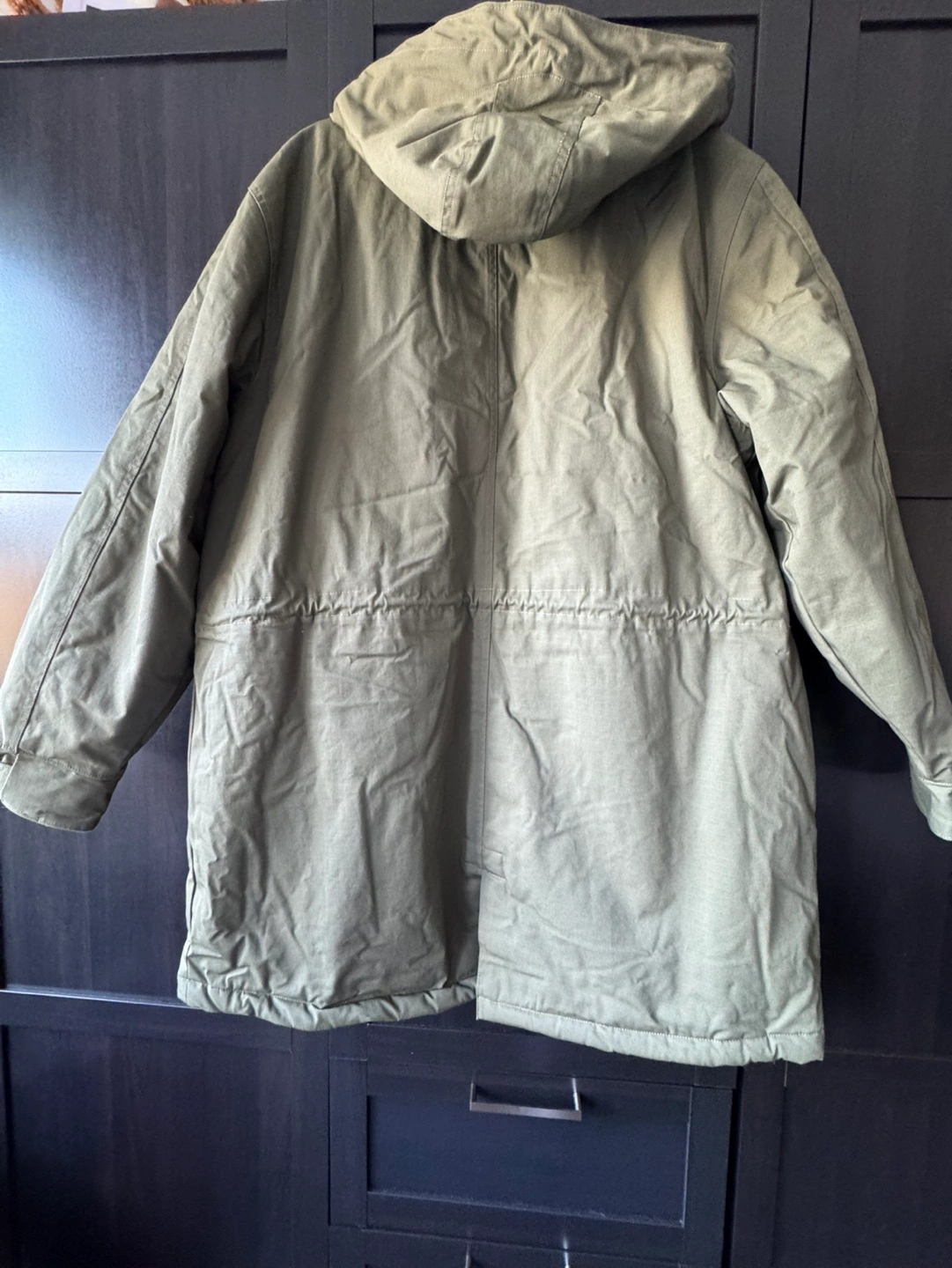 Green winter jacket with a fleece lining. Has a hood and two pockets on the front. Long sleeves.