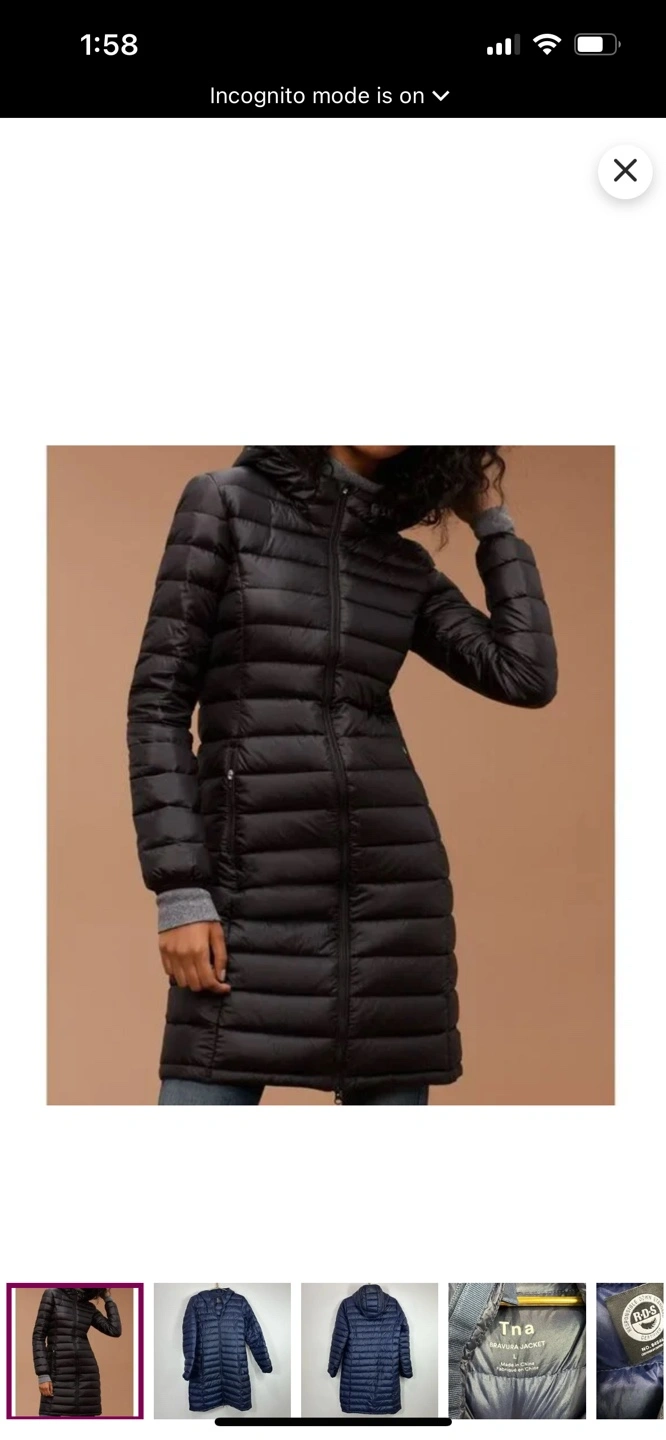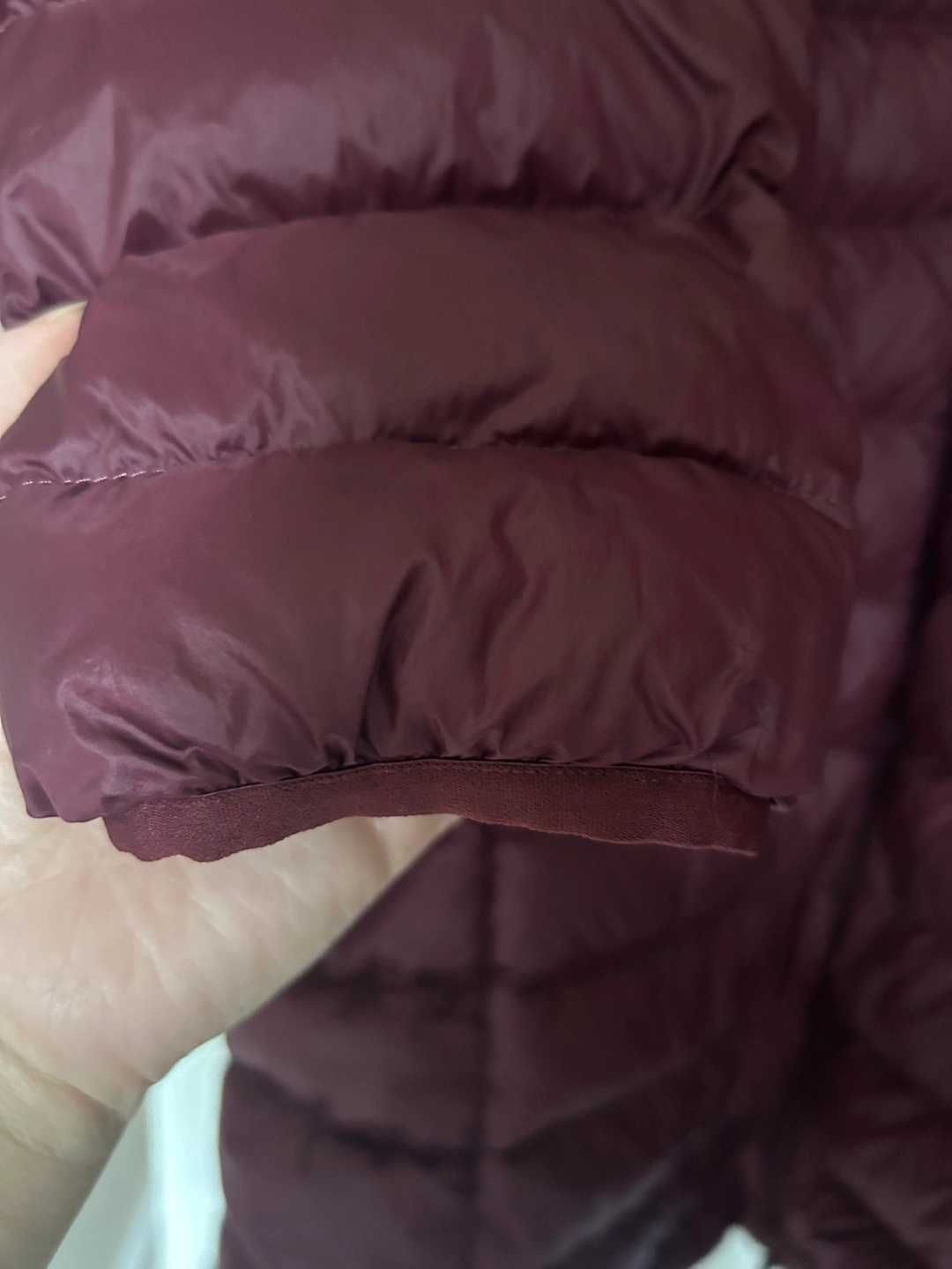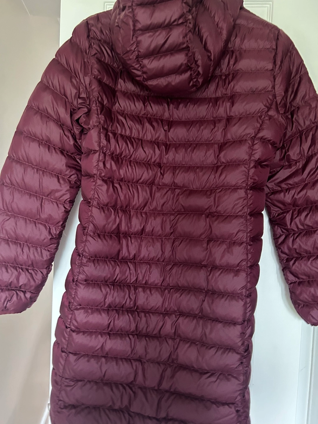 1000+Long, hooded puffer jacket. Features a front zipper closure and two zippered pockets. Large, fits like medium
