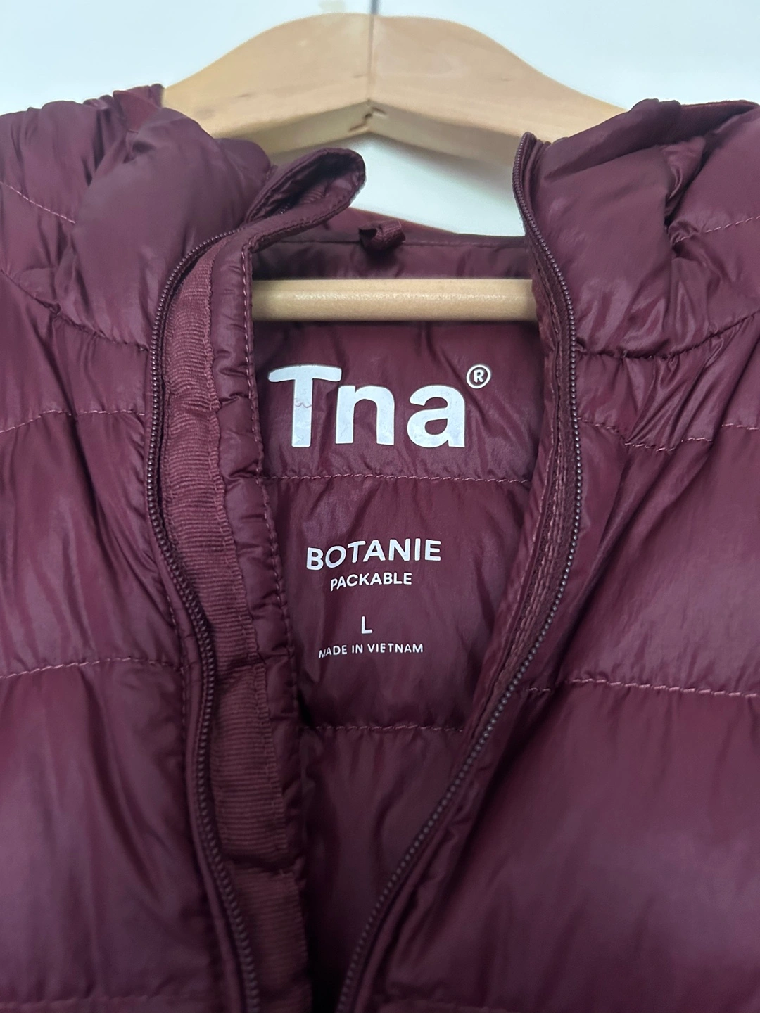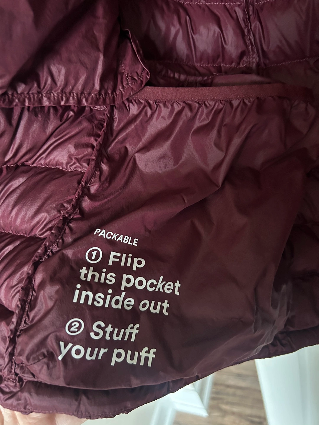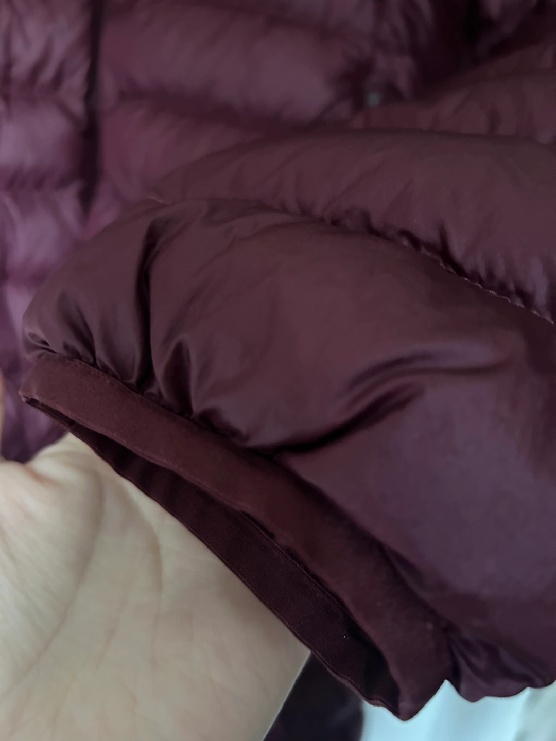 1000+Long, hooded puffer jacket. Features a front zipper closure and two zippered pockets. Large, fits like medium