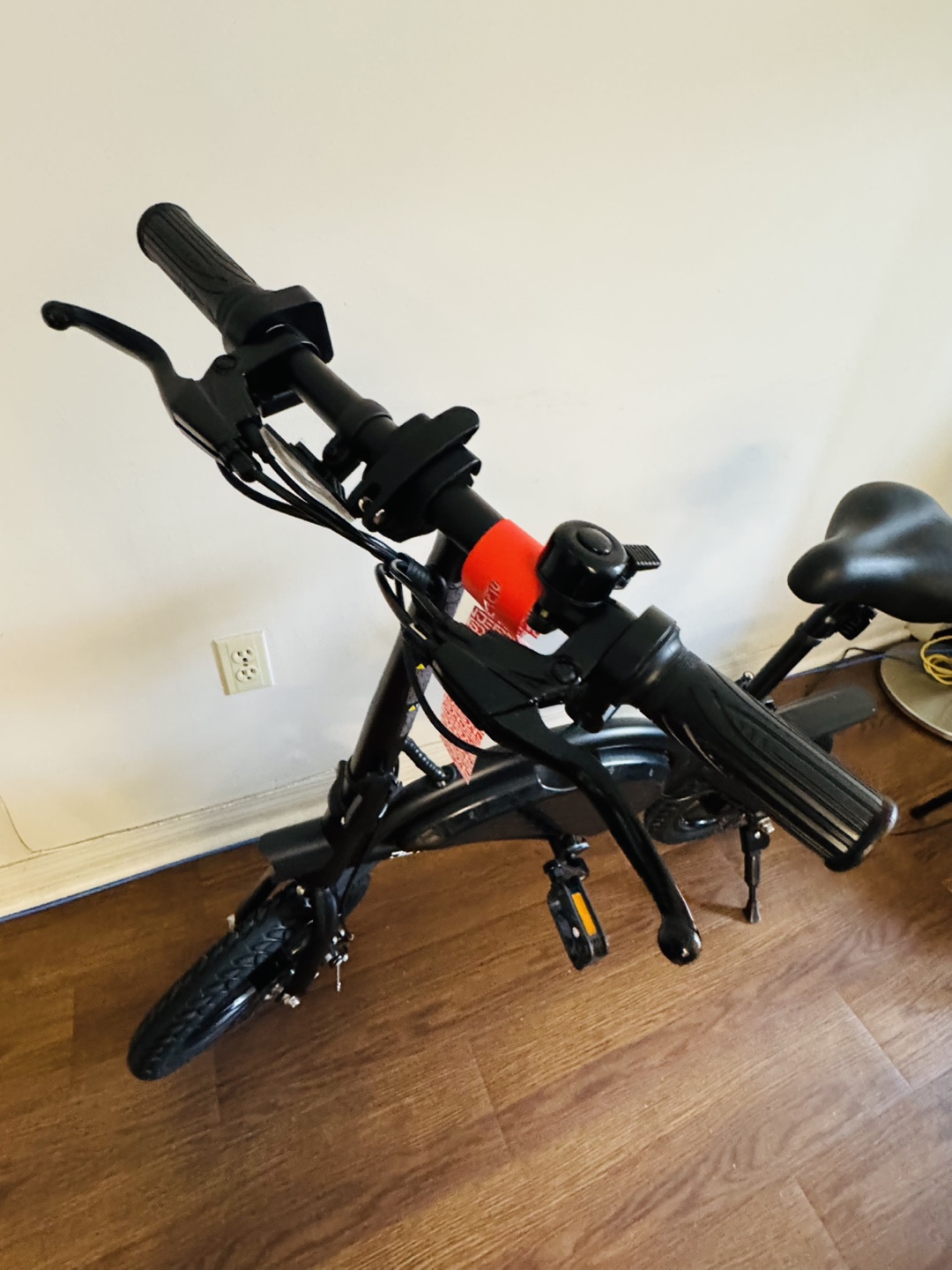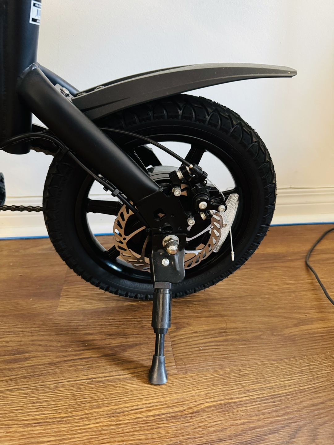 Electric bike with folding frame, disc brakes, and kickstand. It’s foldable too!!!