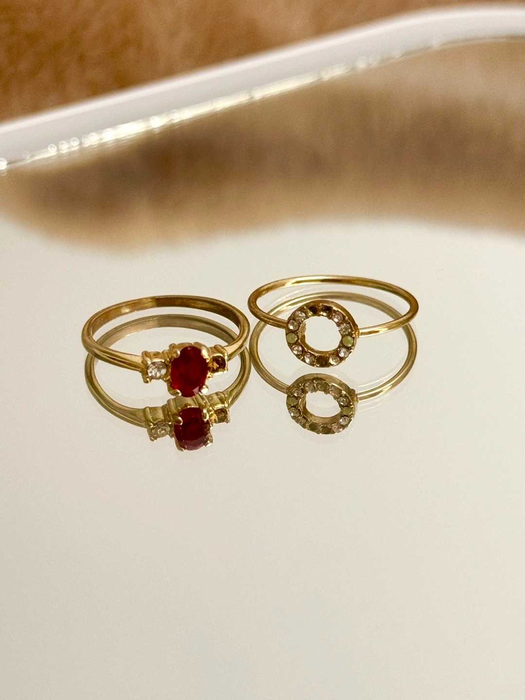Two gold rings. One with a red stone and clear stones. The other has clear stones that form a circle.