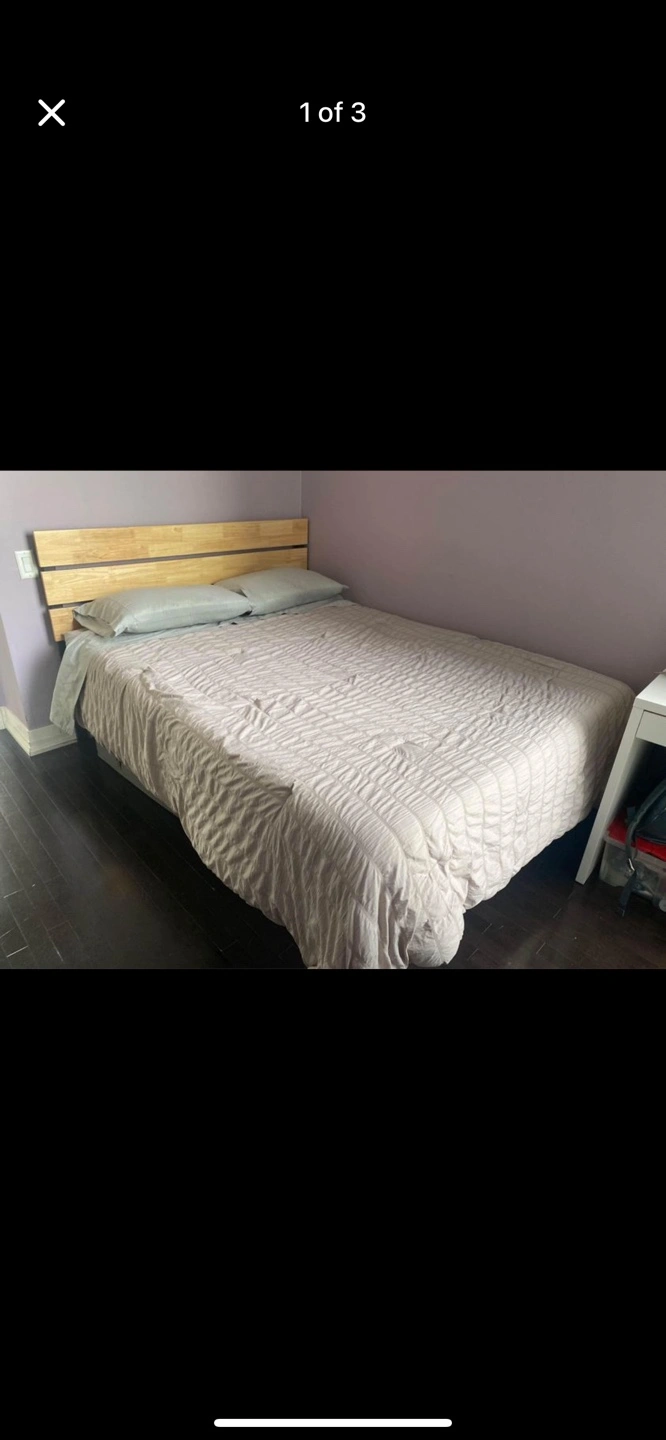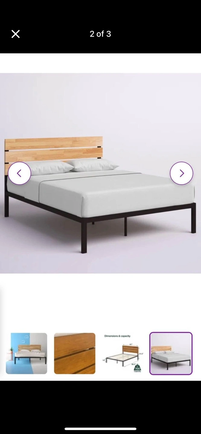 Black metal frame with a wooden headboard. The frame is in great condition. It includes slats for mattress support.