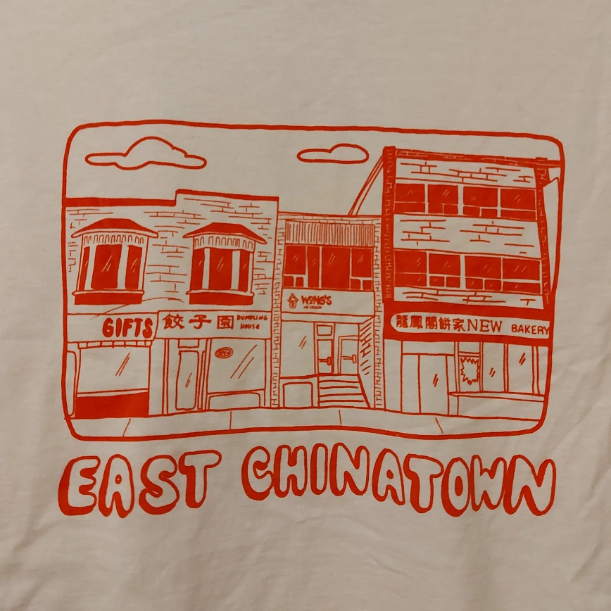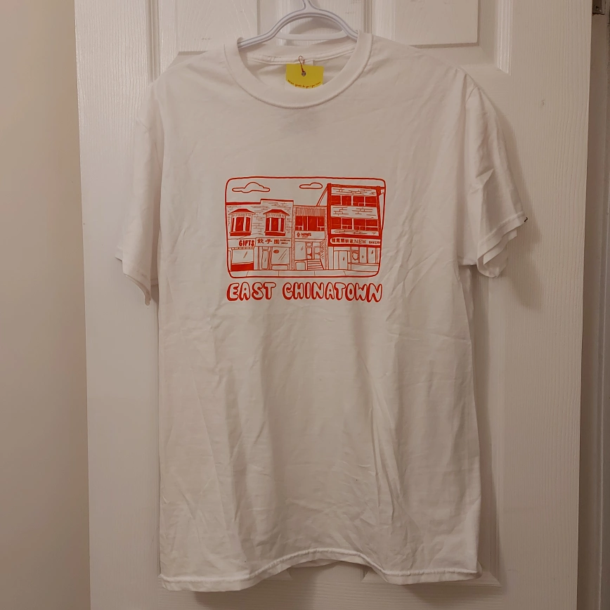 White t-shirt with a red graphic of shops on a street in East Chinatown Toronto. The shirt is size Medium men's sizing I think. Never worn except to try on.