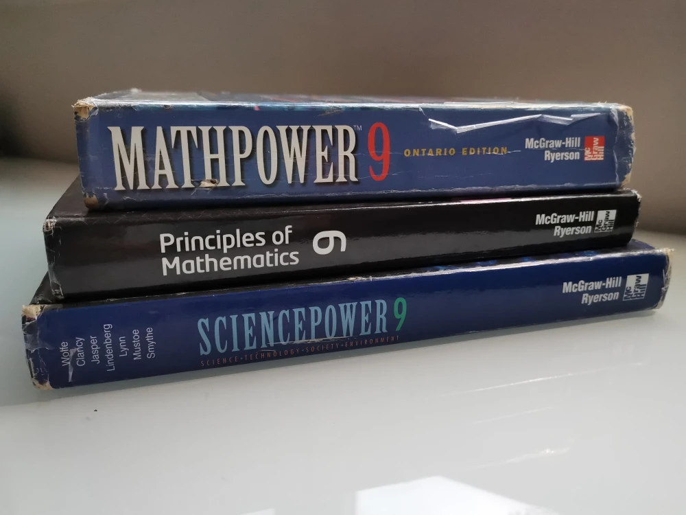 Buy & SellGrade 9 Mathematics and Science TextbooksGrade 9 Mathematics and Science Textbooks$30Set of three textbooks for grade 9. Includes Mathpower 9, Sciencepower 9, and Principles of Mathematics 9.WHERE TO MEETShops on SteelesView MapSELLERChloeHillcrest Village261 review0 chats·0 favorites·5 viewsSEND CHAT TO SELLERHi Chloe! I’m interested in your listing.Hi Chloe! I’m interested in your listing.Get the Karrot app to chatSign In to chat