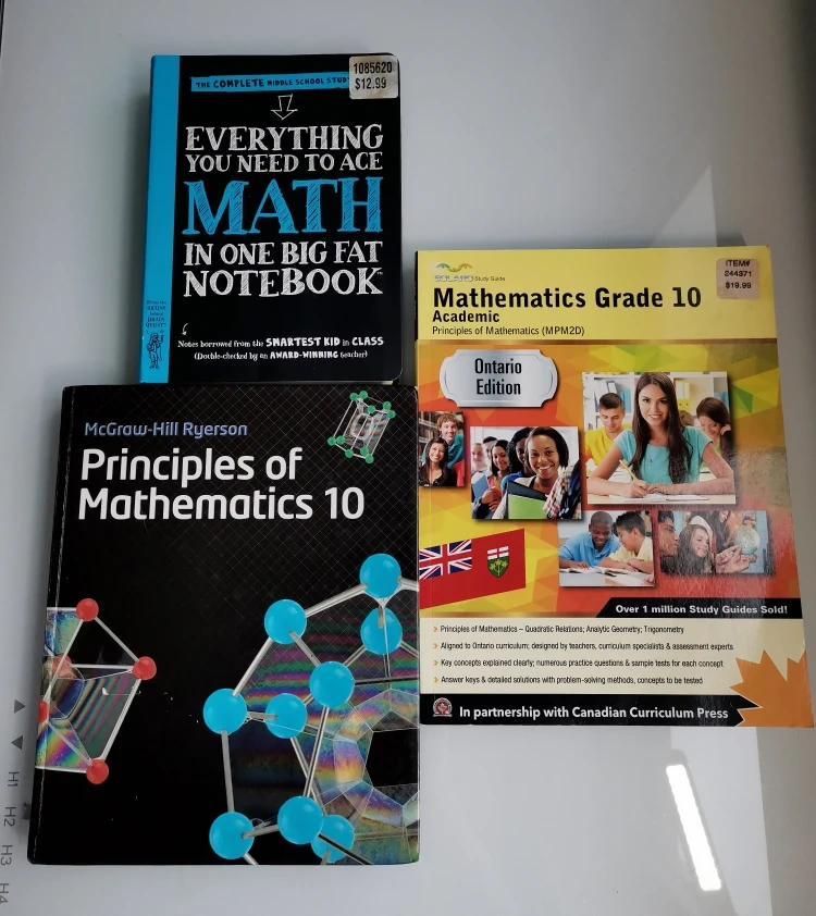 Three textbooks: Principles of Mathematics 10, McGraw-Hill Ryerson, Mathematics Grade 10 Academic, Principles of Mathematics (MPM2D), Ontario Edition, Castle Rock, and Everything You Need to Ace Math in One Big Fat Notebook