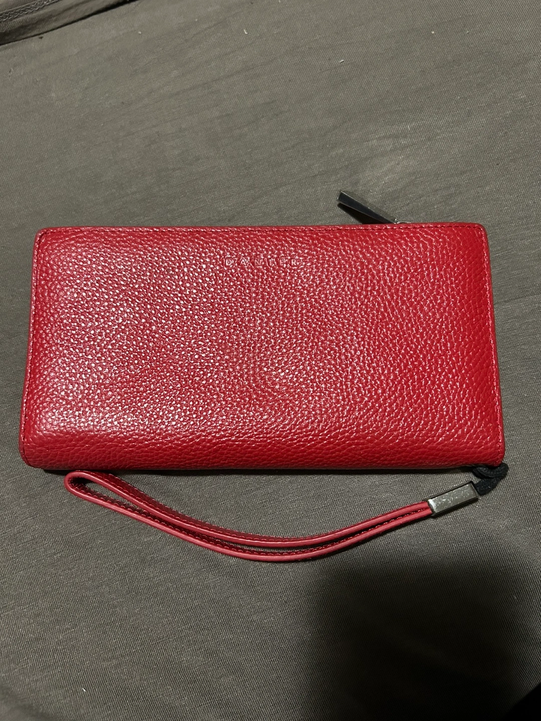 Red leather wallet with wrist strap. Has a zipper closure and multiple card slots, as well as a window for ID. Excellent condition