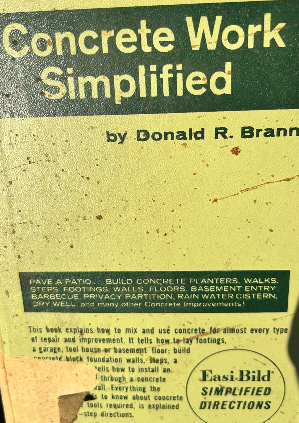 Book explains how to mix and use concrete for almost every type of repair and improvement. It tells how to lay footings, build a garage, tool house or basement floor, build a concrete block foundation walls. Steps: all through a concrete wall. Everything the tools you know, about concrete - step directions, is explained