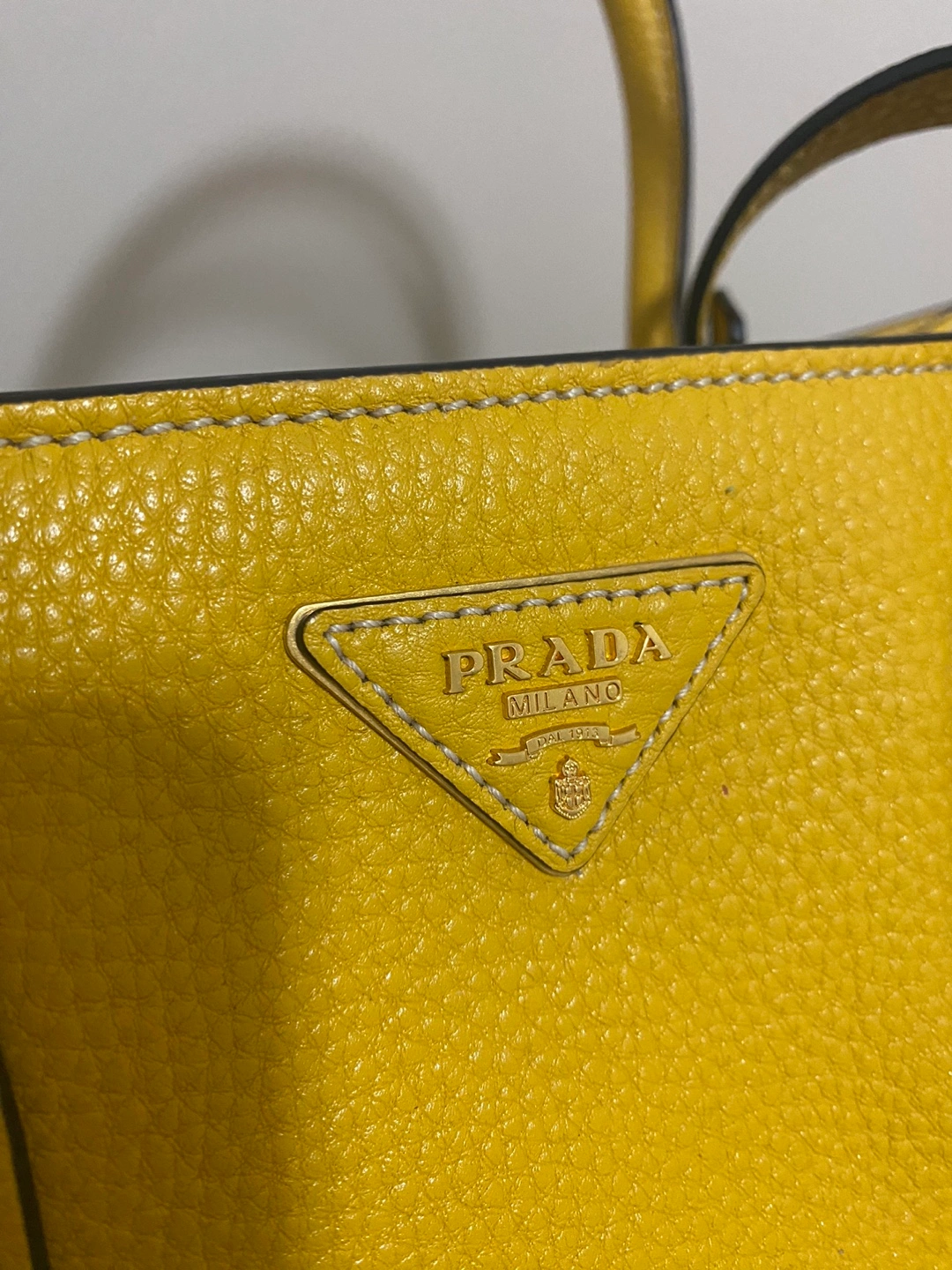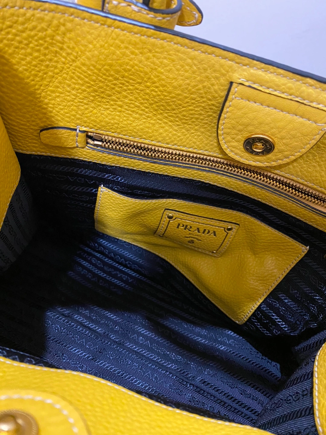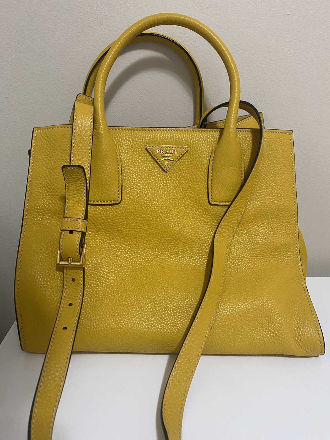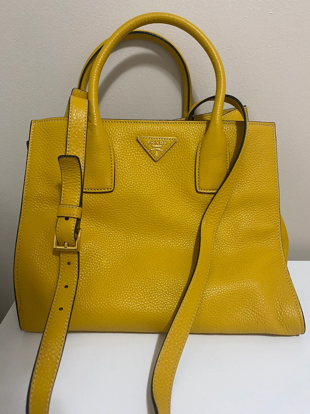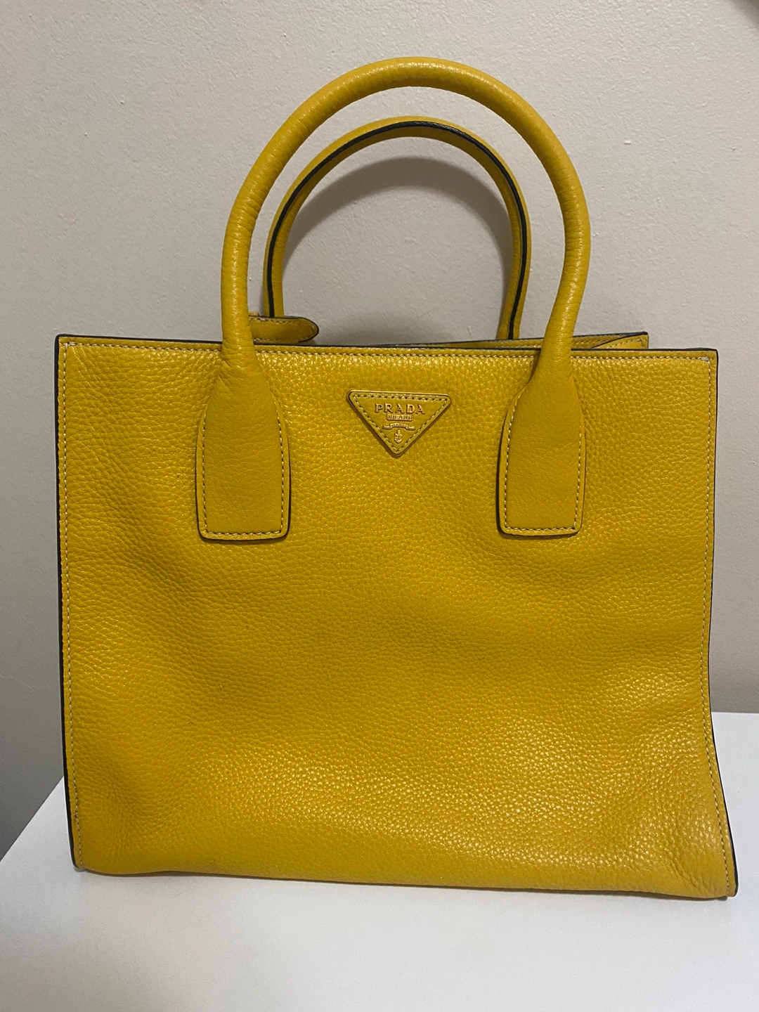 Prada tote bag in yellow leather. Features a top handle and a detachable shoulder strap. Gold-tone hardware. Has a couple of pockets inside. Selling because it's too heavy for me.