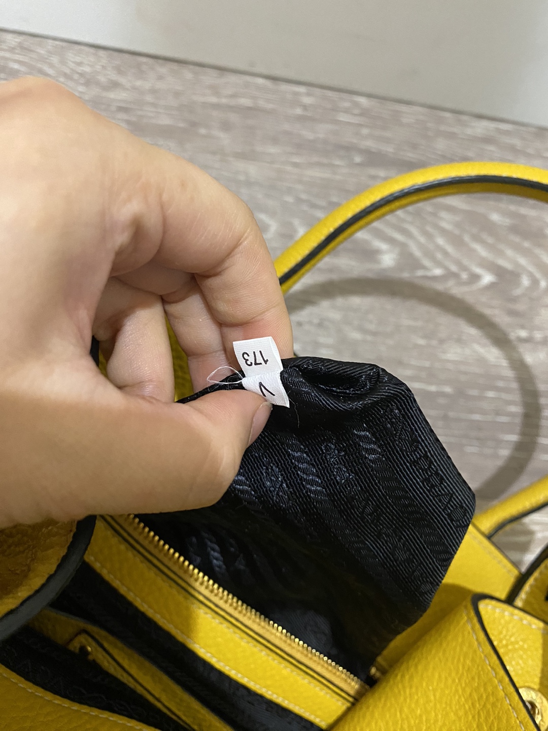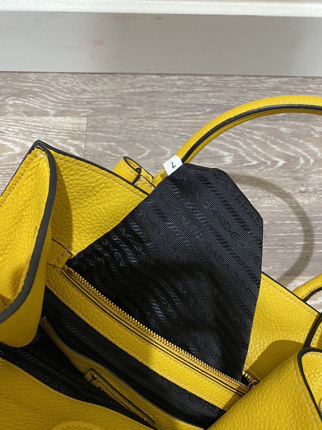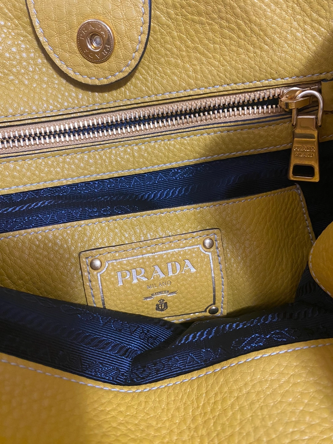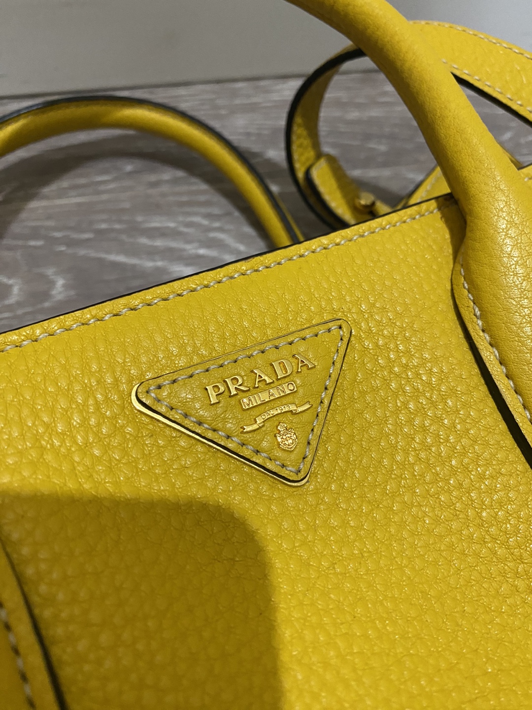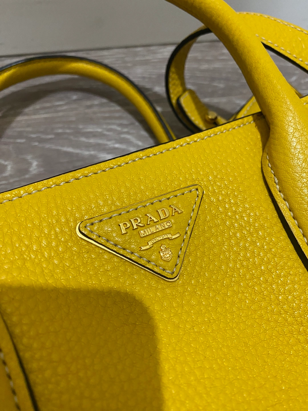Prada tote bag in yellow leather. Features a top handle and a detachable shoulder strap. Gold-tone hardware. Has a couple of pockets inside. Selling because it's too heavy for me.