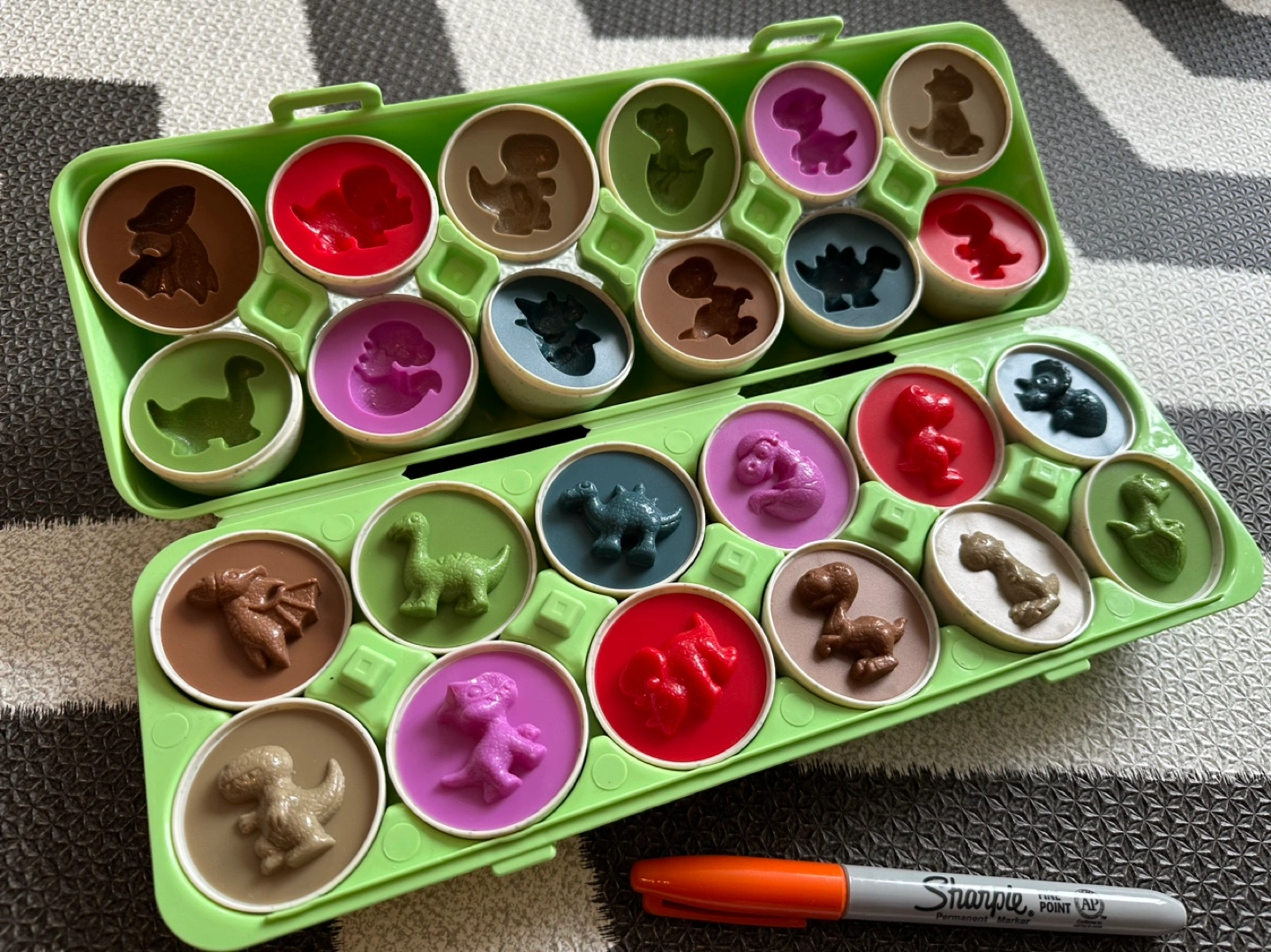 Matching game with plastic eggs. Includes 12 eggs with different dinosaur shapes and colors. Great for toddlers