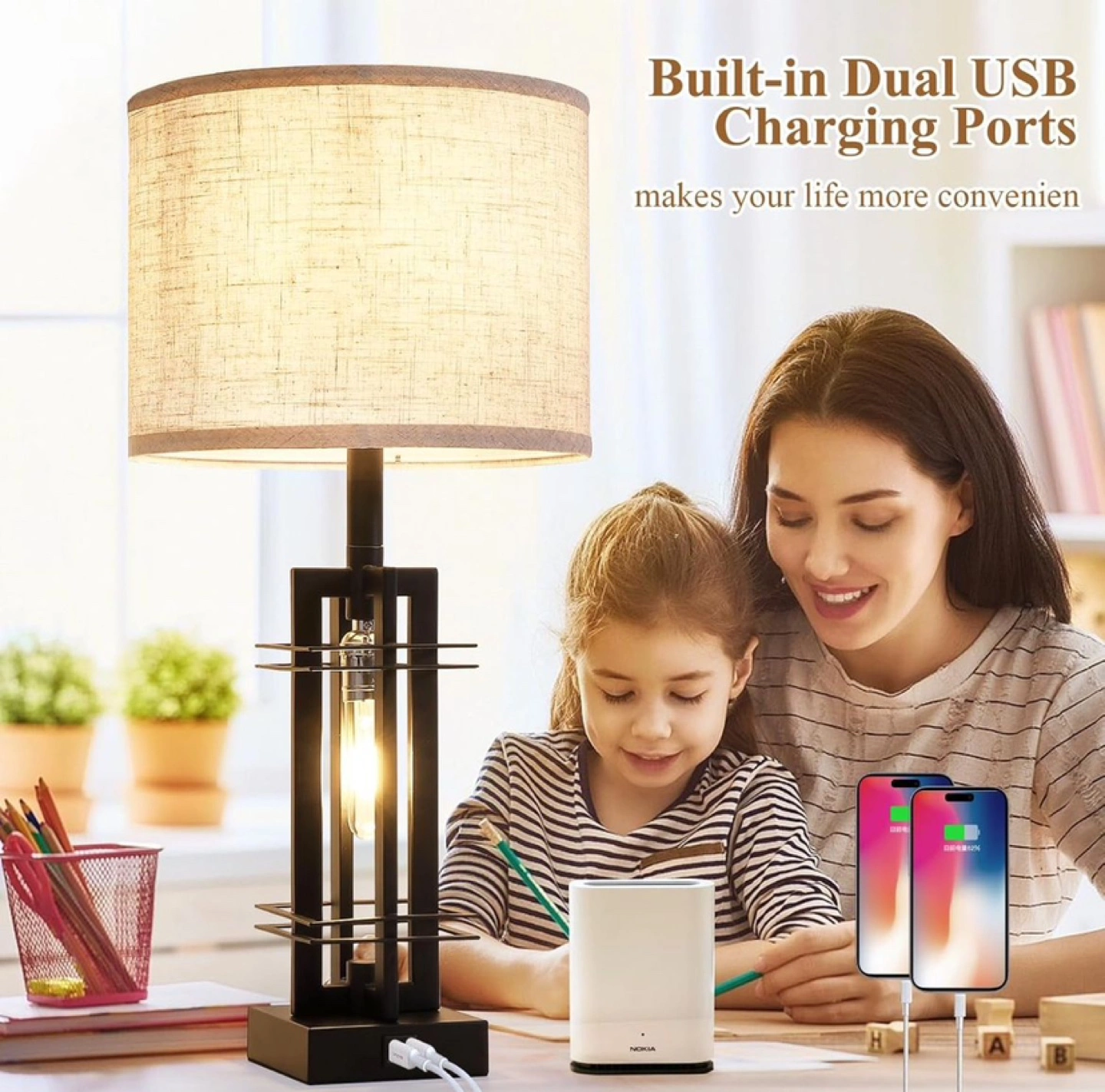 Two table lamps with beige fabric shades. The lamps have a black metal frame with a geometric design and a built-in dual USB charging port. Great for beside a bed or on a nightstand.