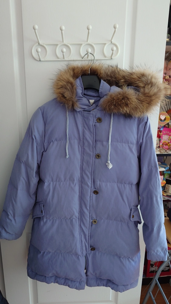 239Light blue down jacket with a detachable built-in pouch with snap closures for your baby carrier to keep your baby warm and close to your body. Features a fur hood.