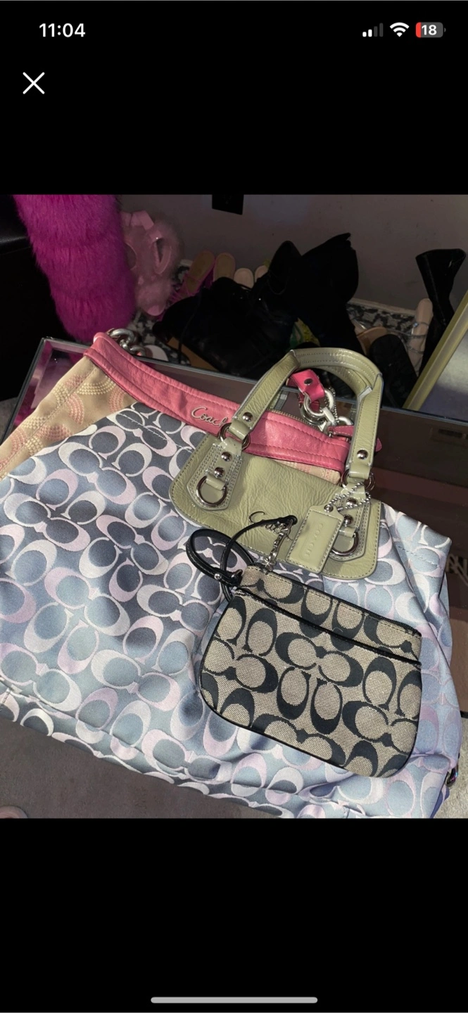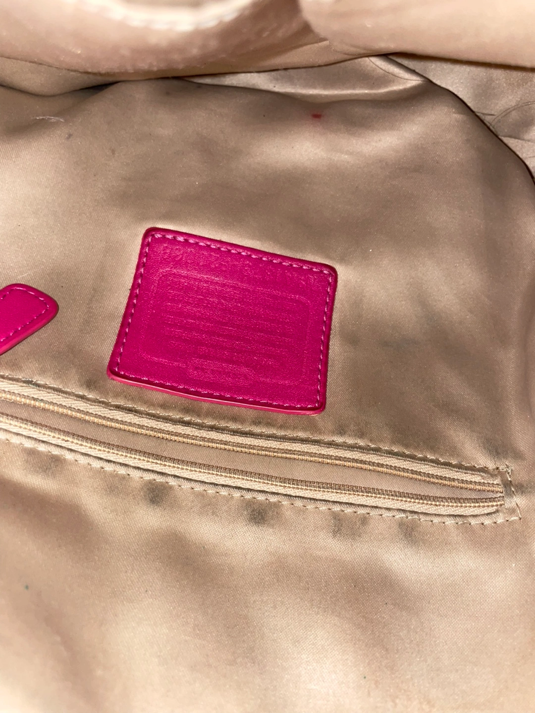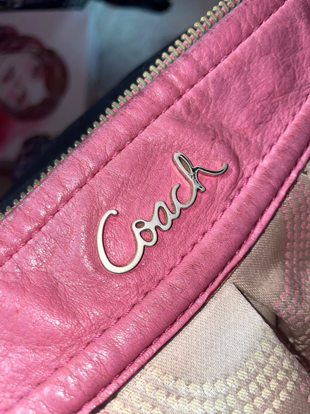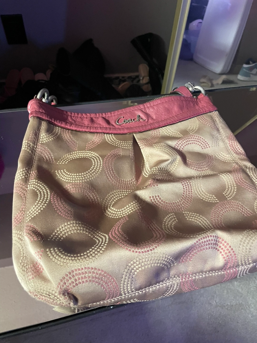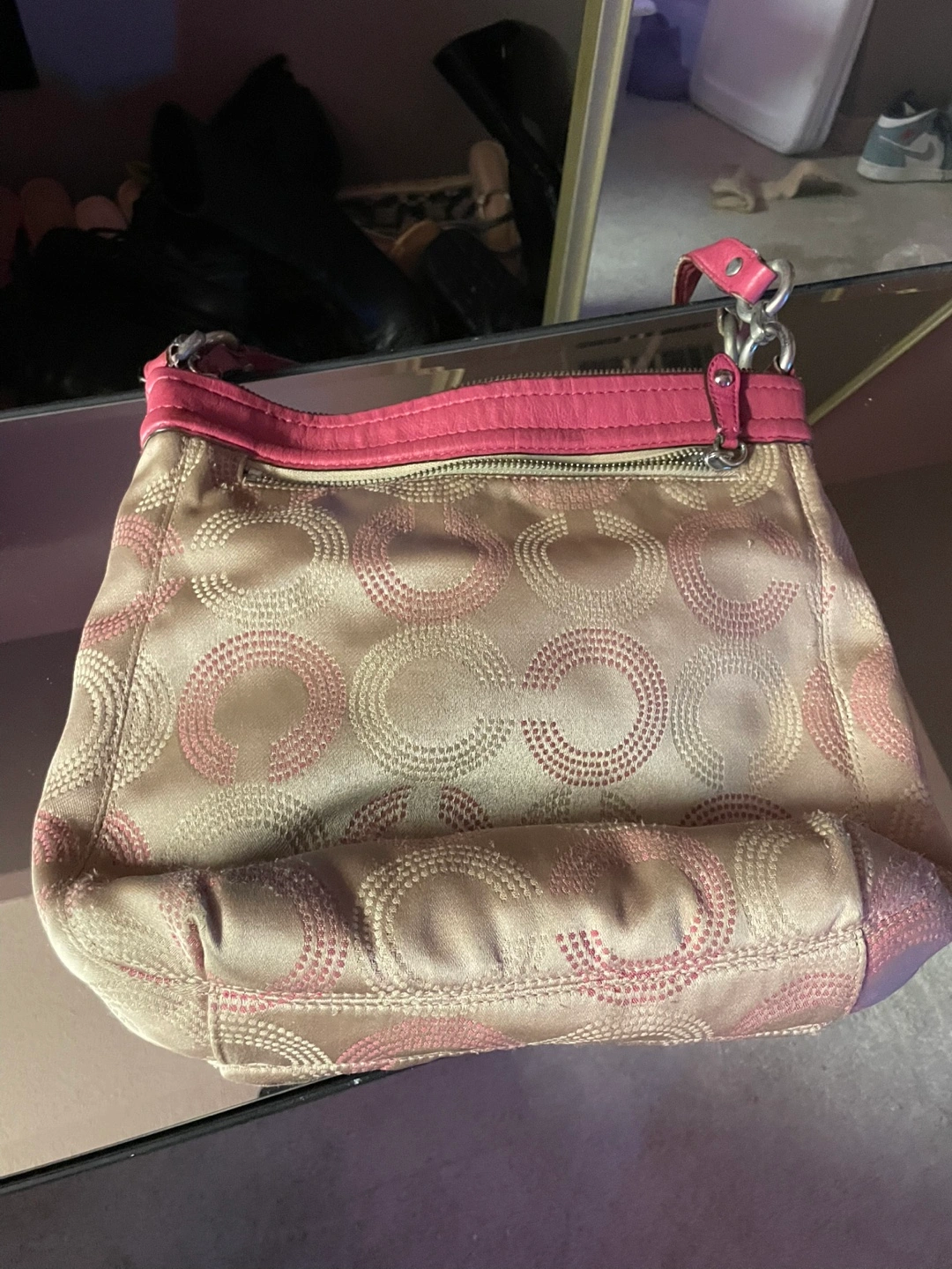 Pre-loved Coach shoulder bag. Tan with pink signature C pattern, pink leather accents. Has a zipper closure and a zipper pocket on the inside.