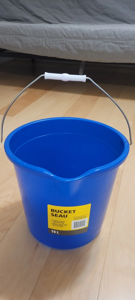 10L blue plastic bucket with a metal handle. Sturdy construction, mould resistant.