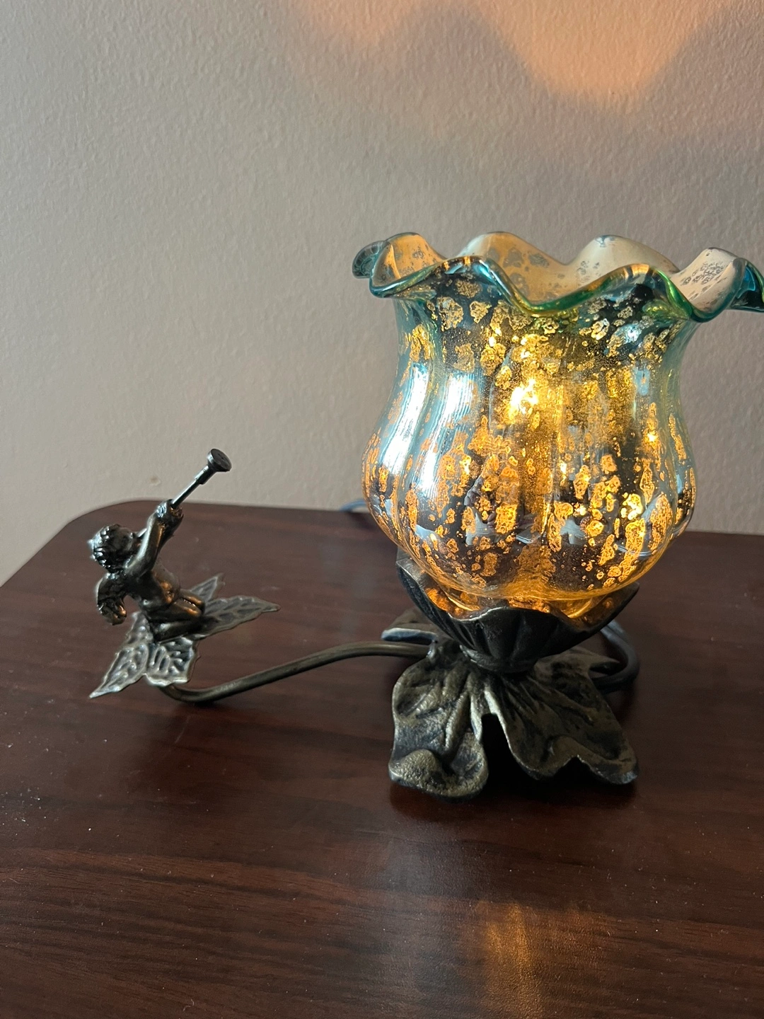 Two teal and gold glass and metal table lamps with a decorative metal base. One lamp has a decorative metal cherub with a trumpet. Both lamps are new and never been used.
