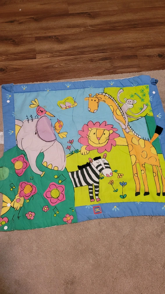 Play mat with jungle animal theme. Features a giraffe, lion, elephant, zebra and birds.