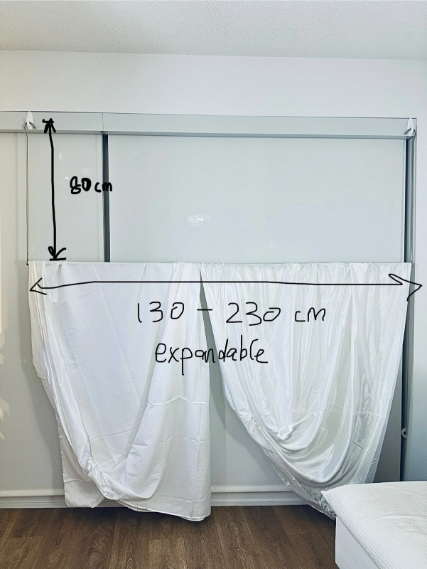 Expandable closet rod. Extends from 130 to 230 cm. Comes with hooks for hanging.