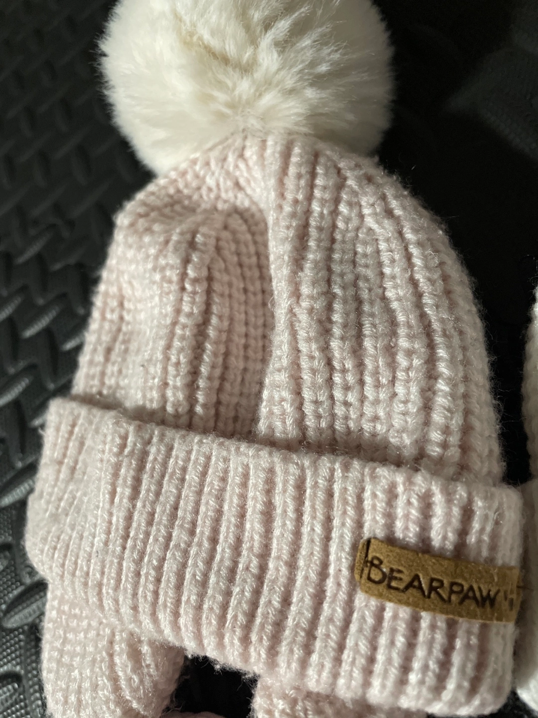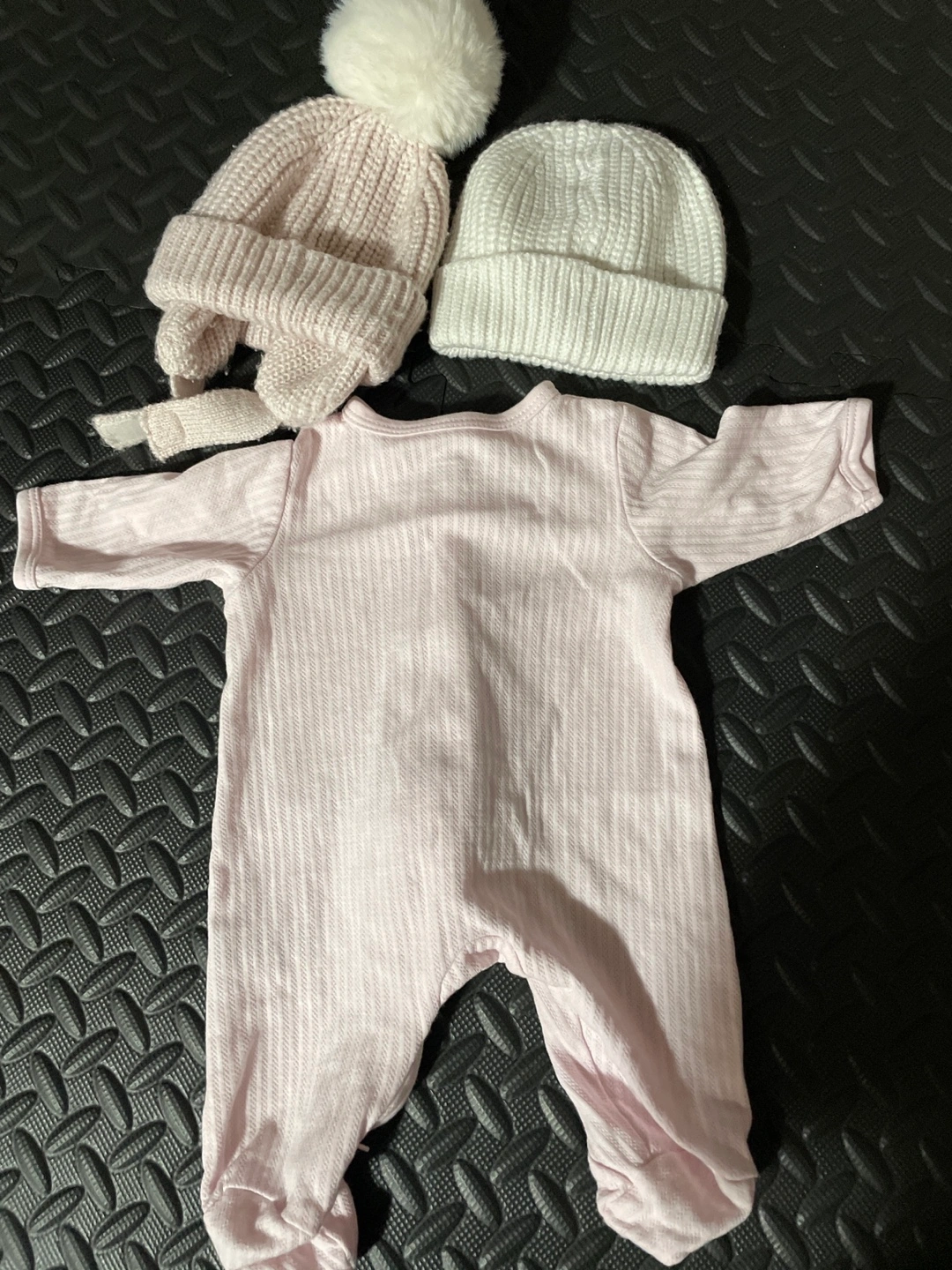 Pink onesie with bunnies and rainbow embroidery. Two knit hats with pom-poms, one pink and one white.