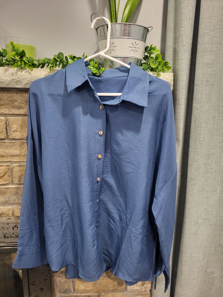 Blue long sleeve button up shirt with a collared neckline. Has a relaxed fit.
