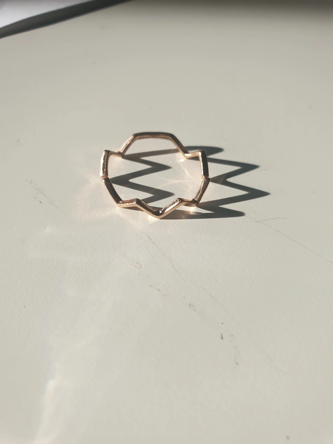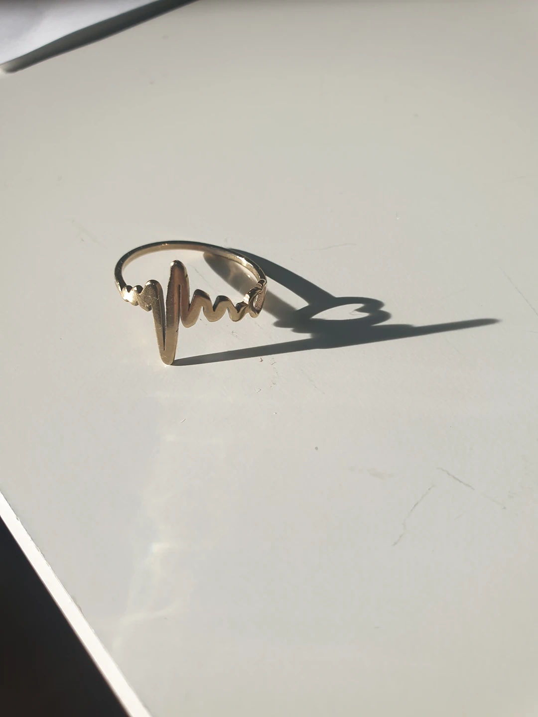 one has a heartbeat and heart design, the other is zig zagged like a crown. unsure the size but maybe 7 or 8? they're a little big on me and I have average fingers lol