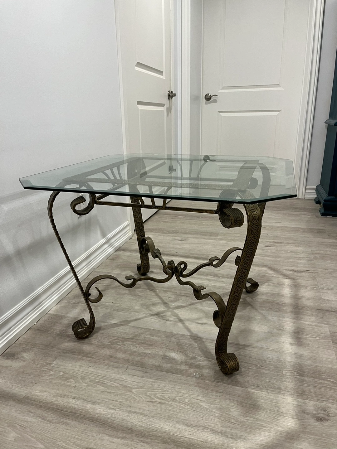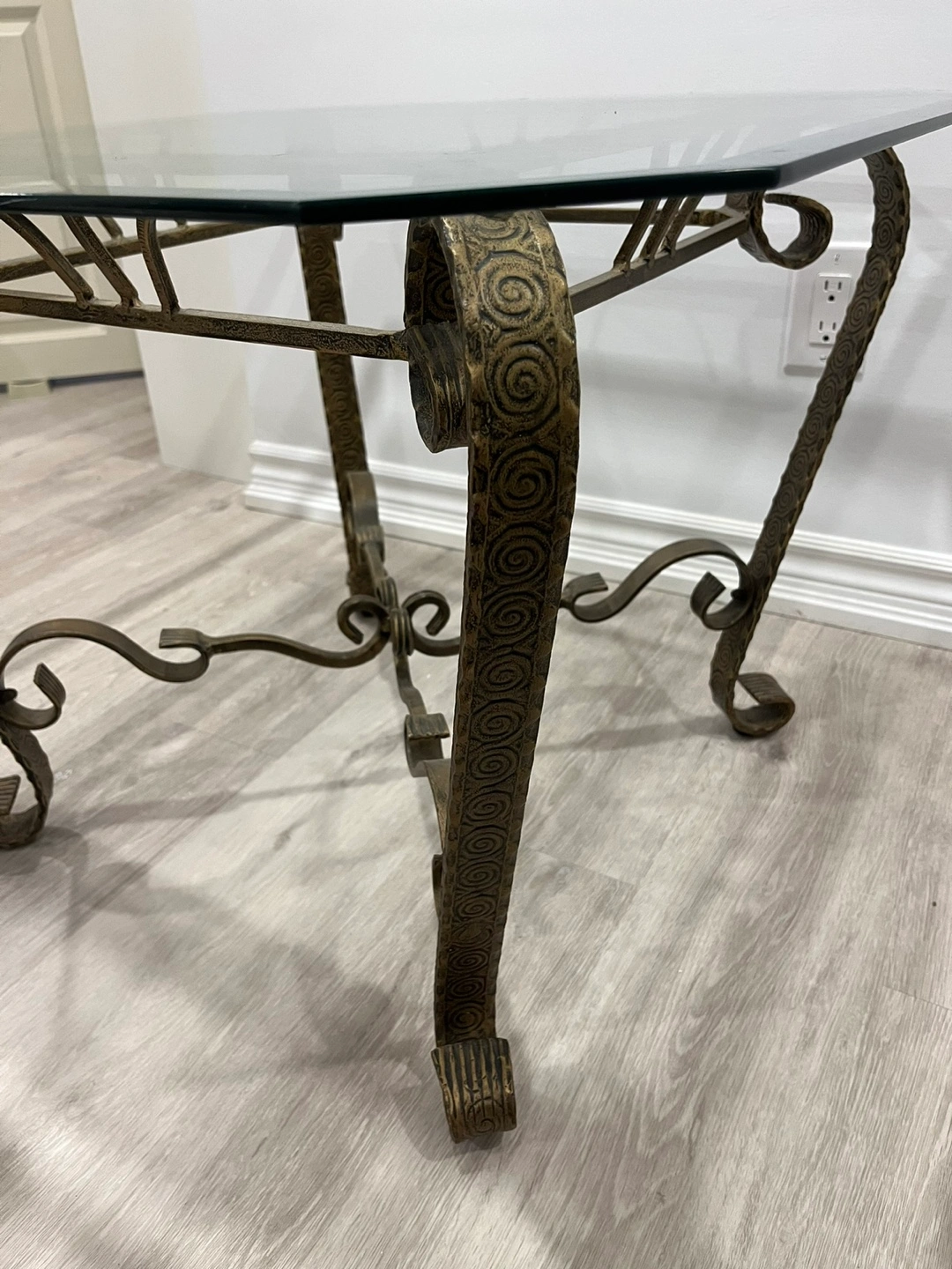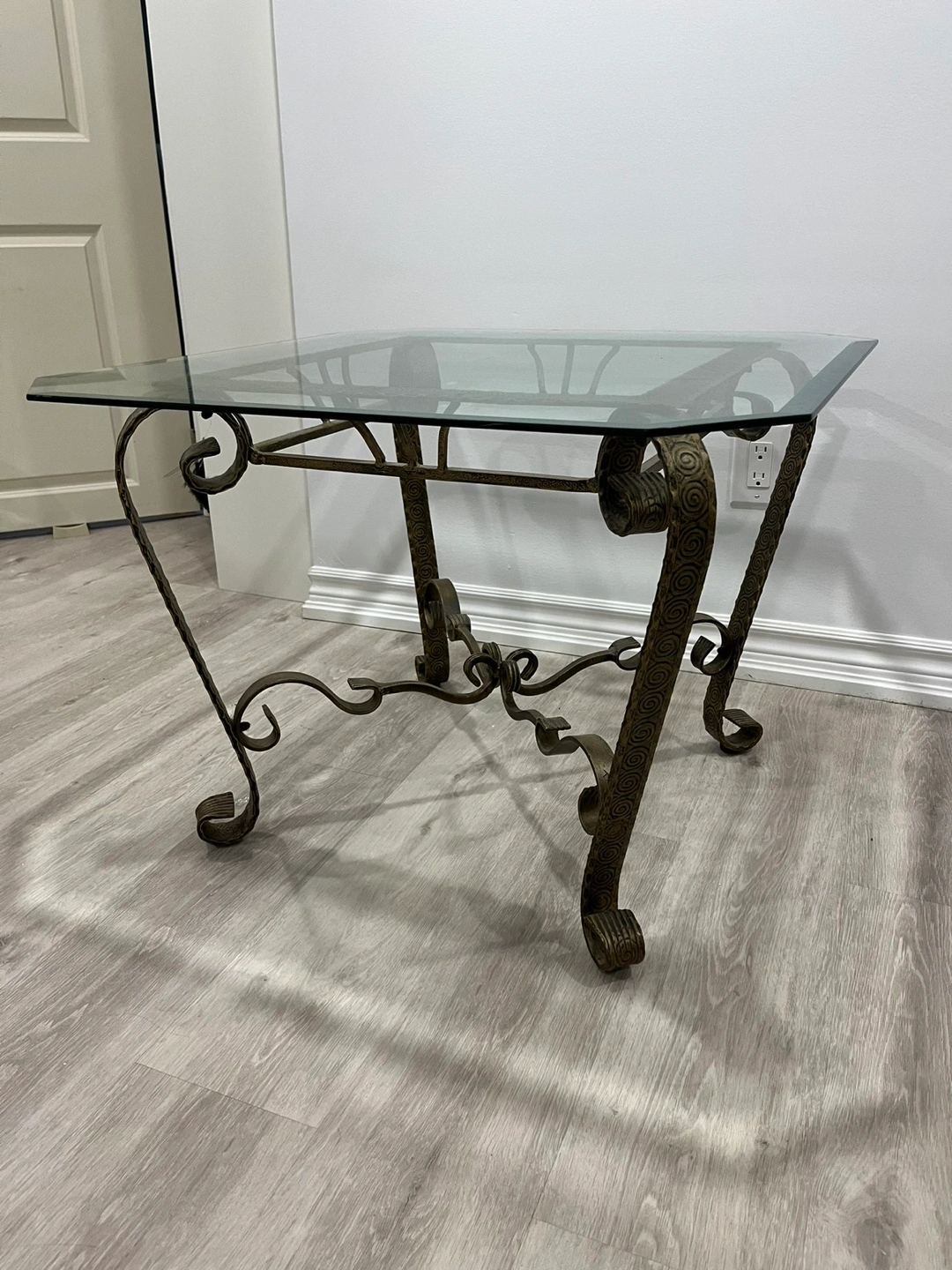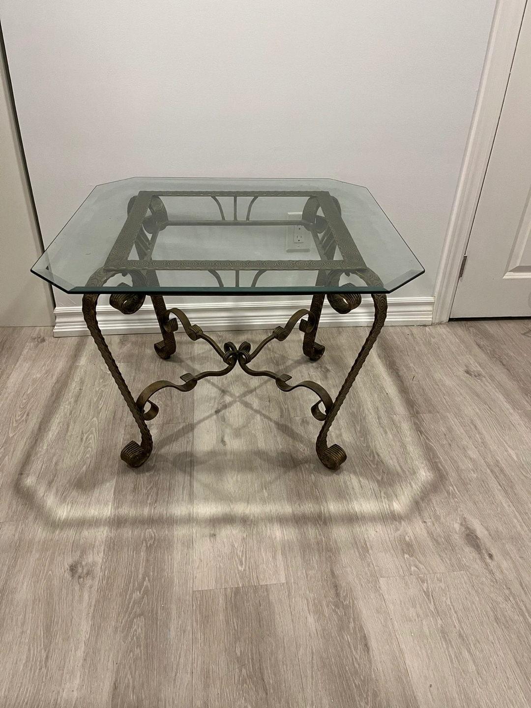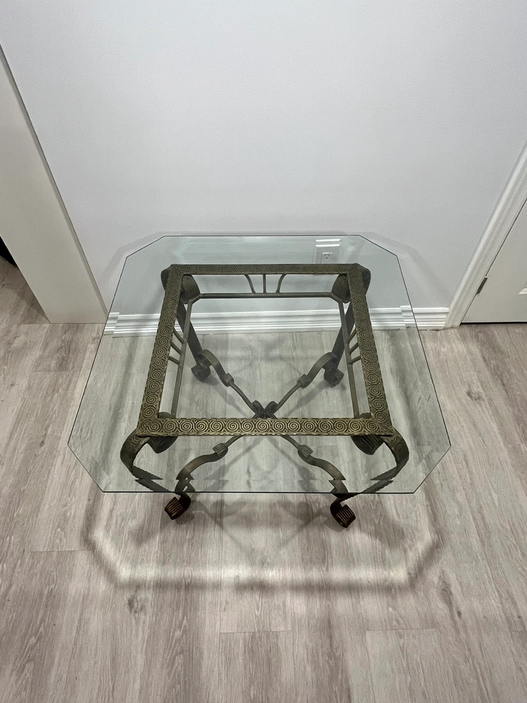 This listing is for a glass and metal end table or a small coffee table. The glass is a rounded square shape. The metal has an ornate pattern and is a dark gold. Both the glass and metal are heavy. In great condition!