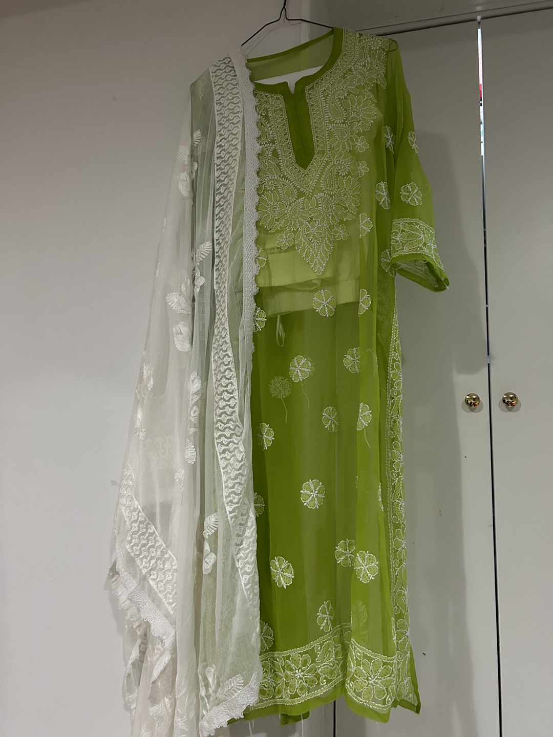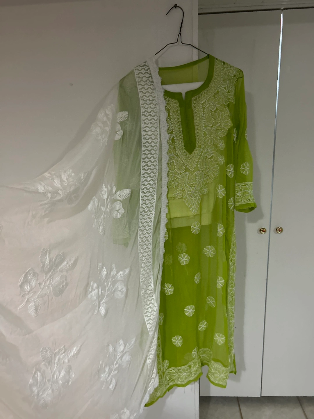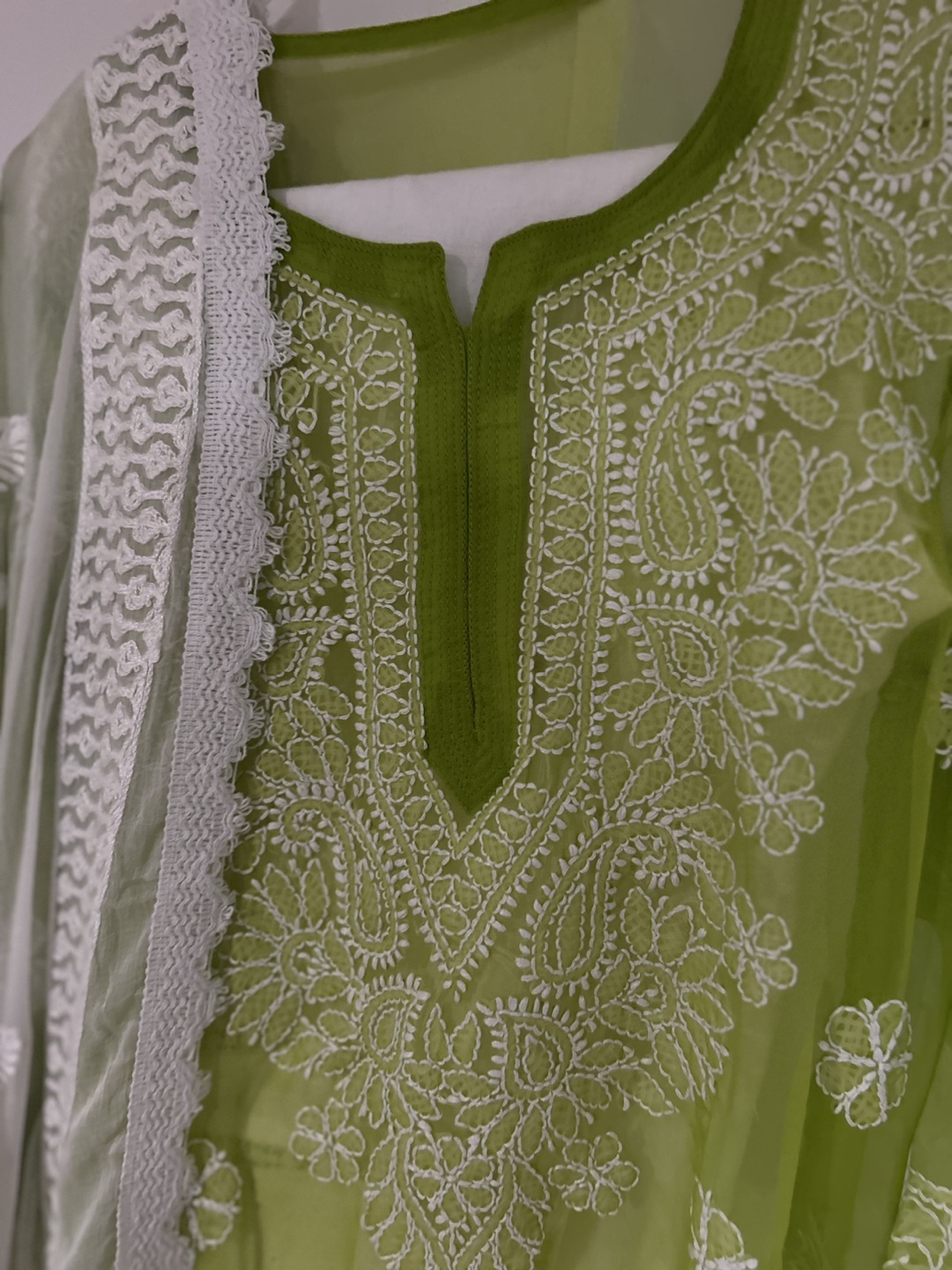 Green Chikankari kurta set with a matching dupatta. The kurta has intricate embroidery and a V-neckline. The dupatta is sheer and has a delicate floral pattern.