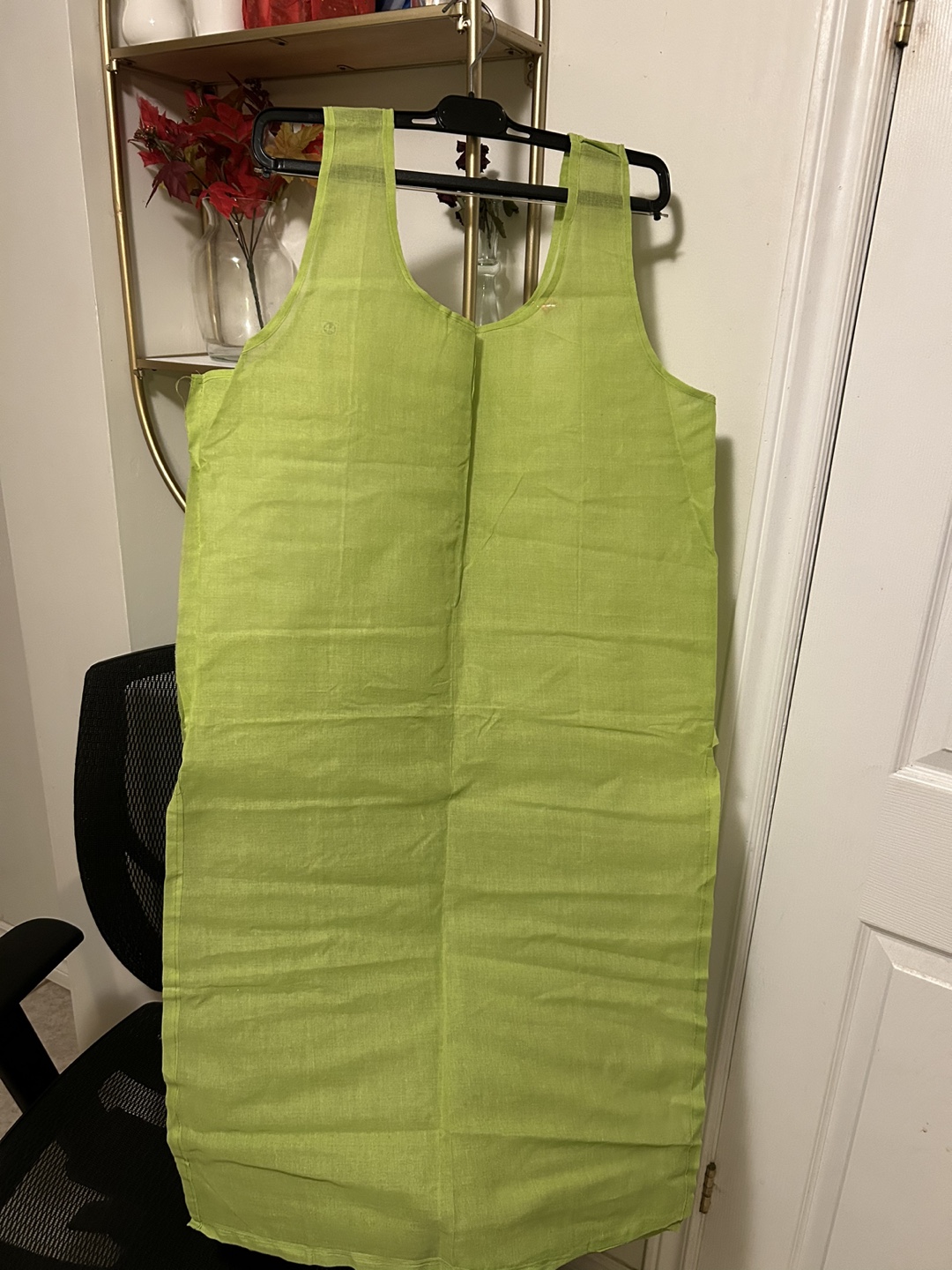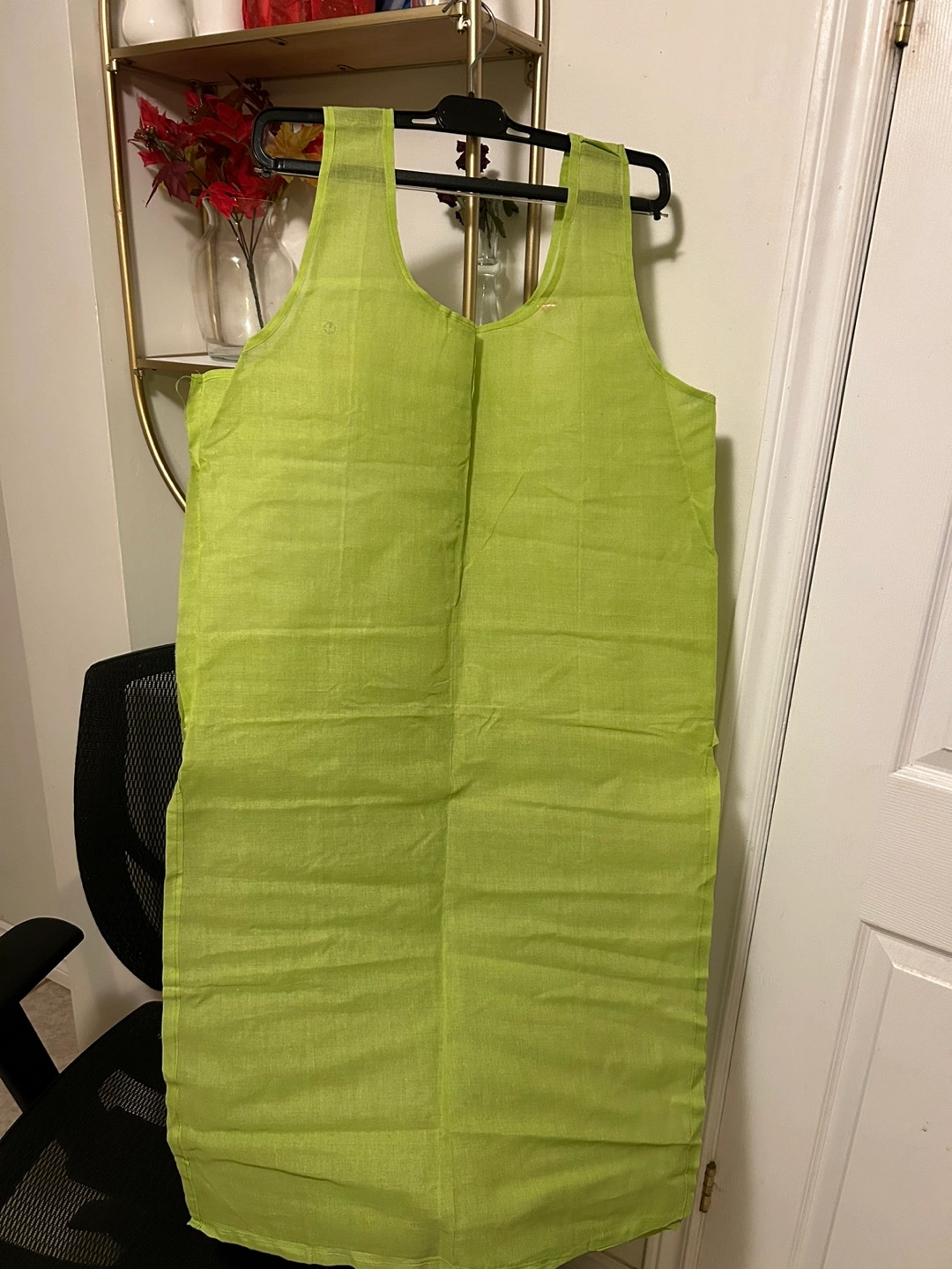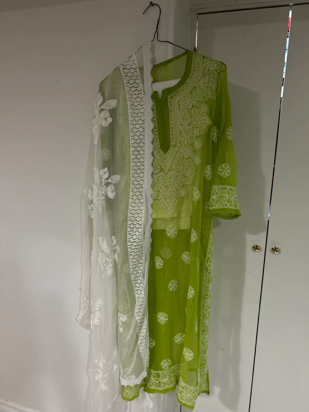 Green Chikankari kurta set with a matching dupatta. The kurta has intricate embroidery and a V-neckline. The dupatta is sheer and has a delicate floral pattern.