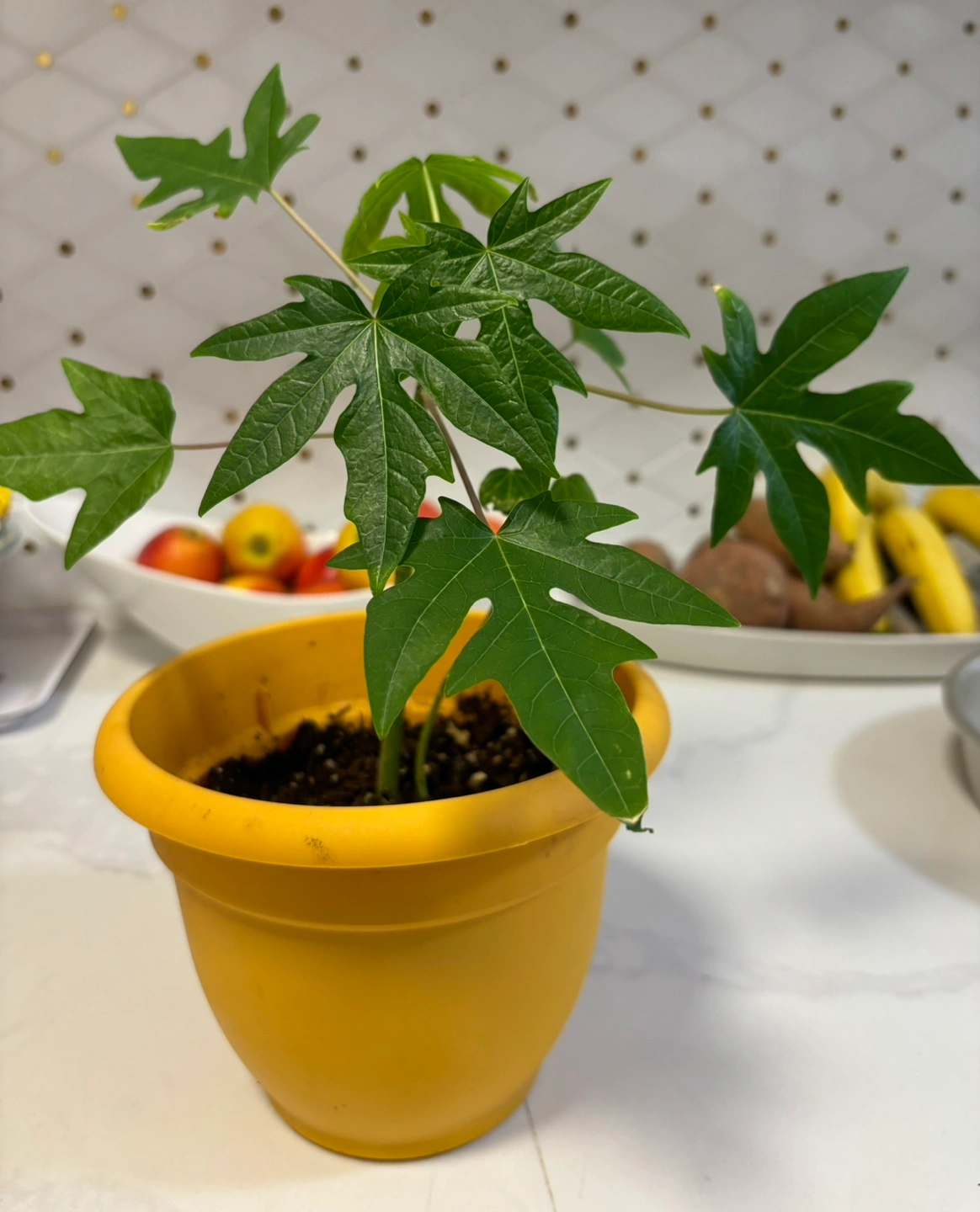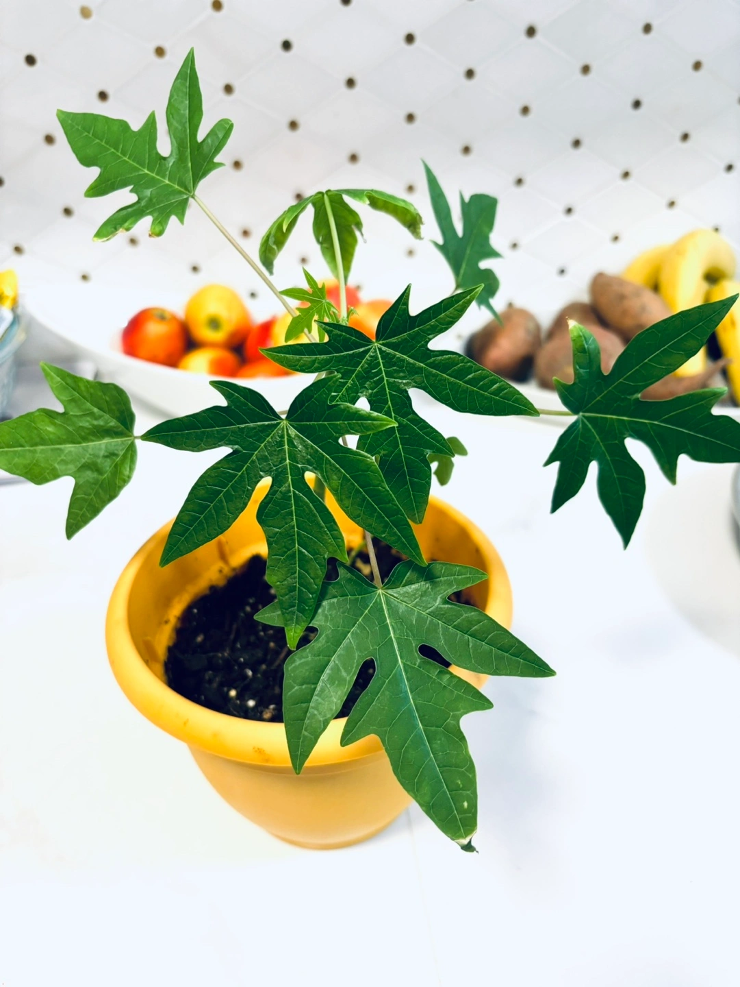 Small papaya plant in a yellow pot. Healthy and growing well.