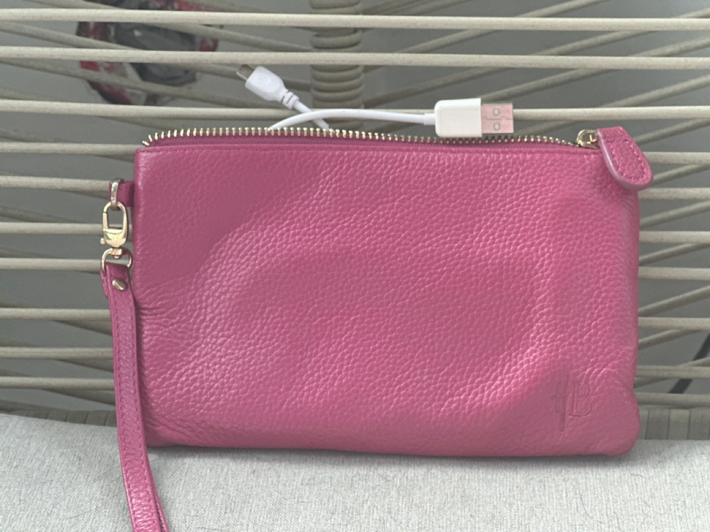 86Pink leather clutch with a wrist strap and zipper closure. Has several inner pockets. It’s also a android phone charger built Into clutch