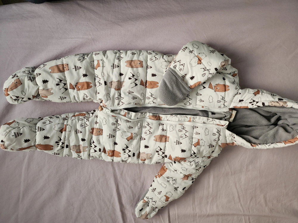 White snowsuit with brown bear pattern. Features a hood and zipper closure. Baby snow suit size 3-6 months. Brand Juniors baby, got it from Qatar.