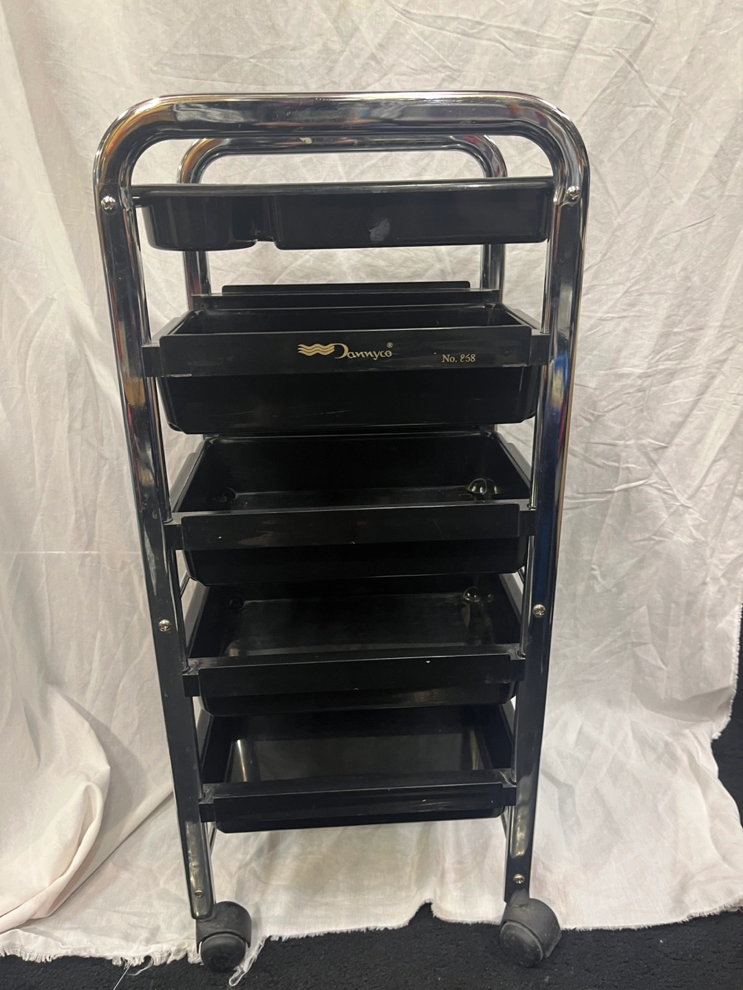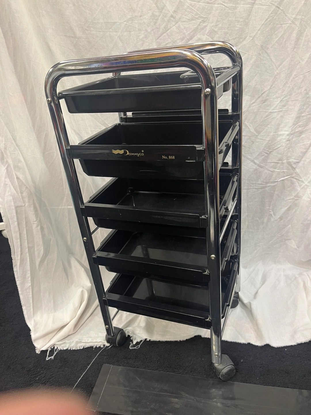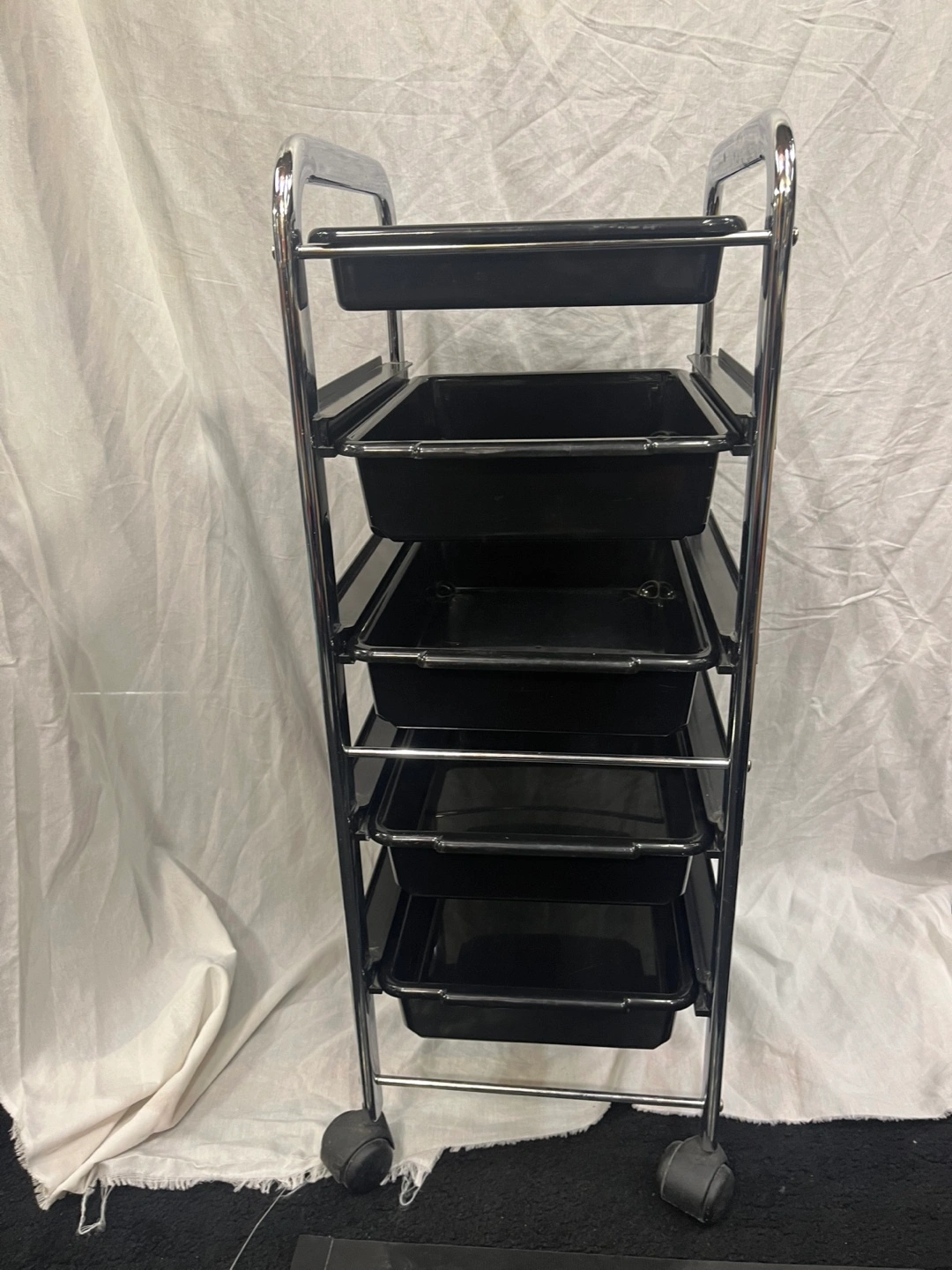 Five tier rolling cart with black plastic trays and a chrome frame. Great for organization.