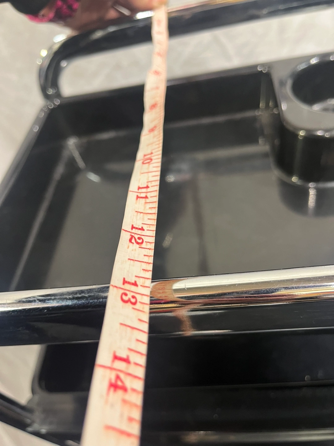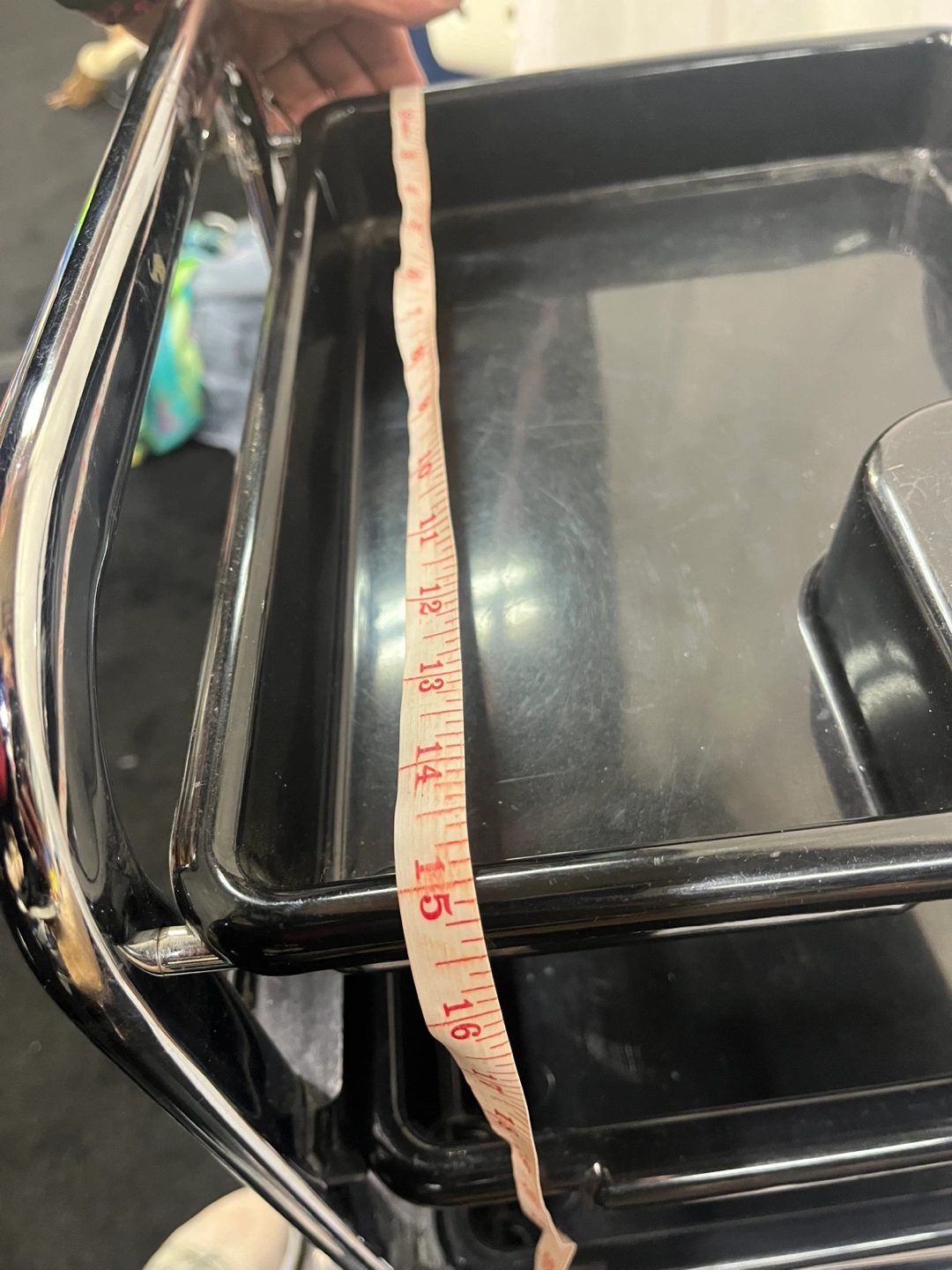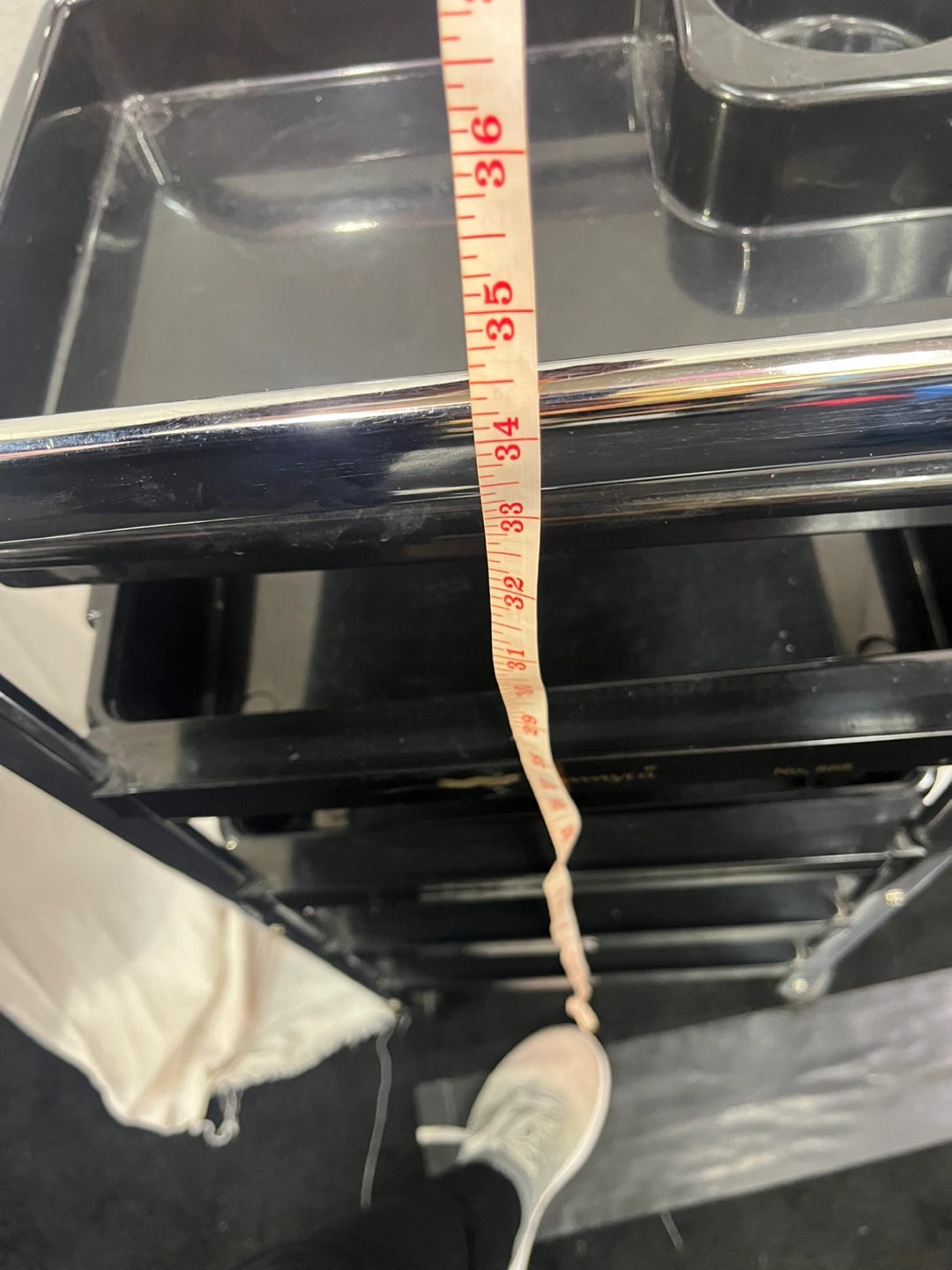 Five tier rolling cart with black plastic trays and a chrome frame. Great for organization.