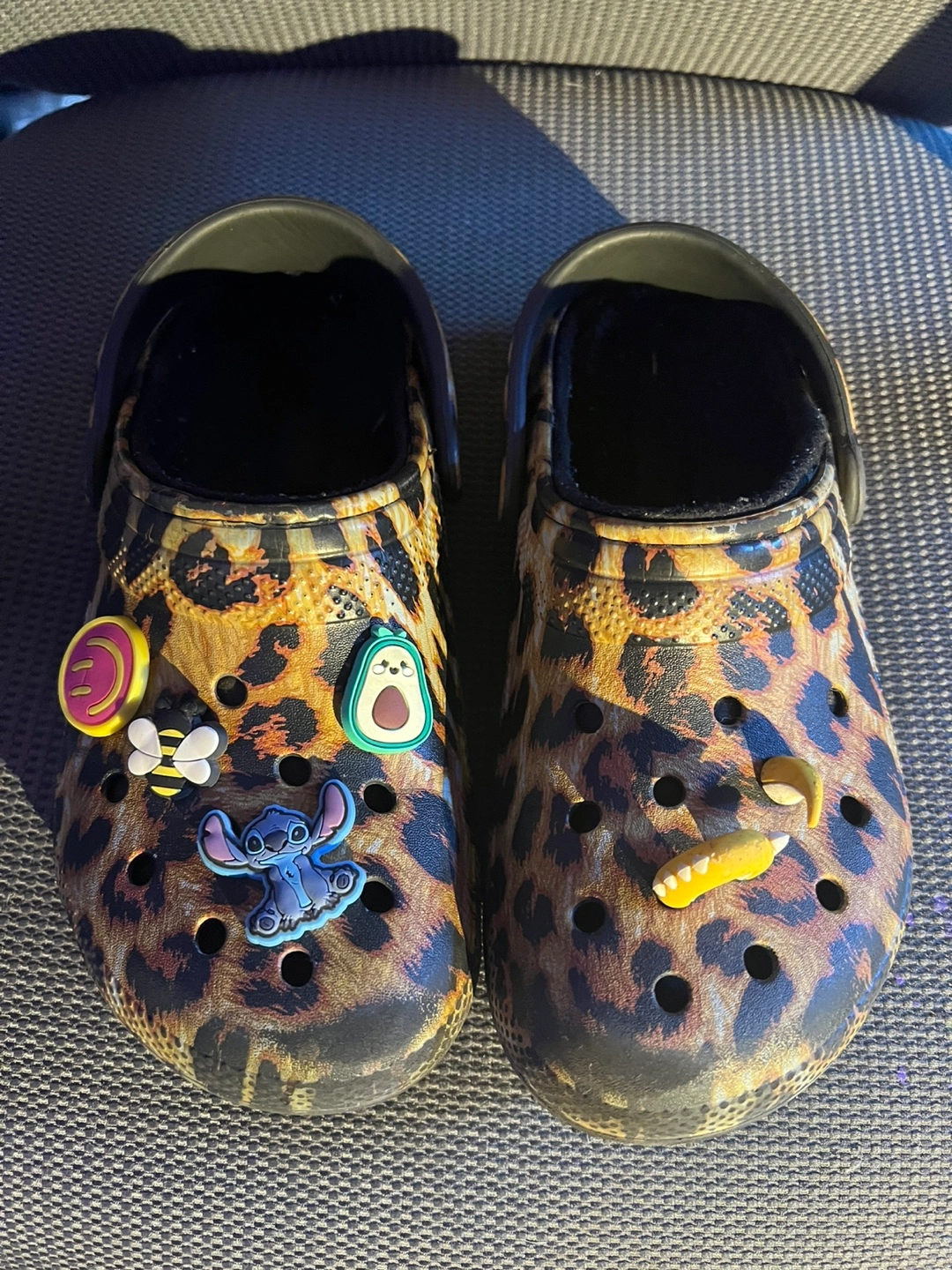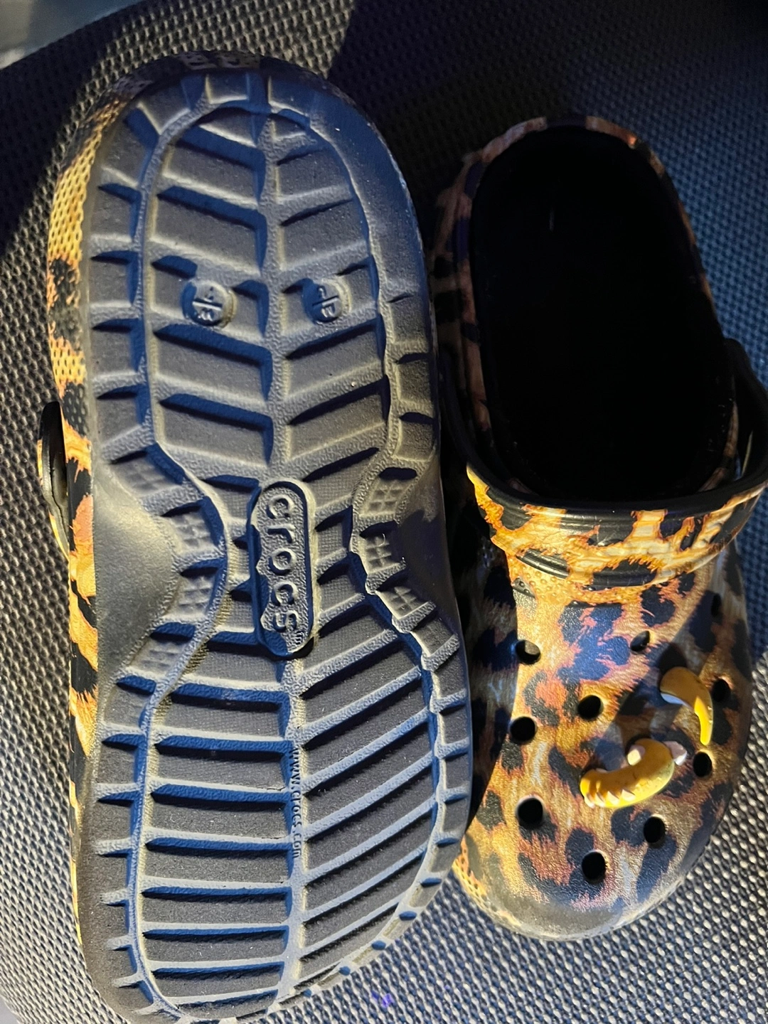 Leopard print clogs with Jibbitz charms. Women's size 7. Selling more than 50% off from the original price.