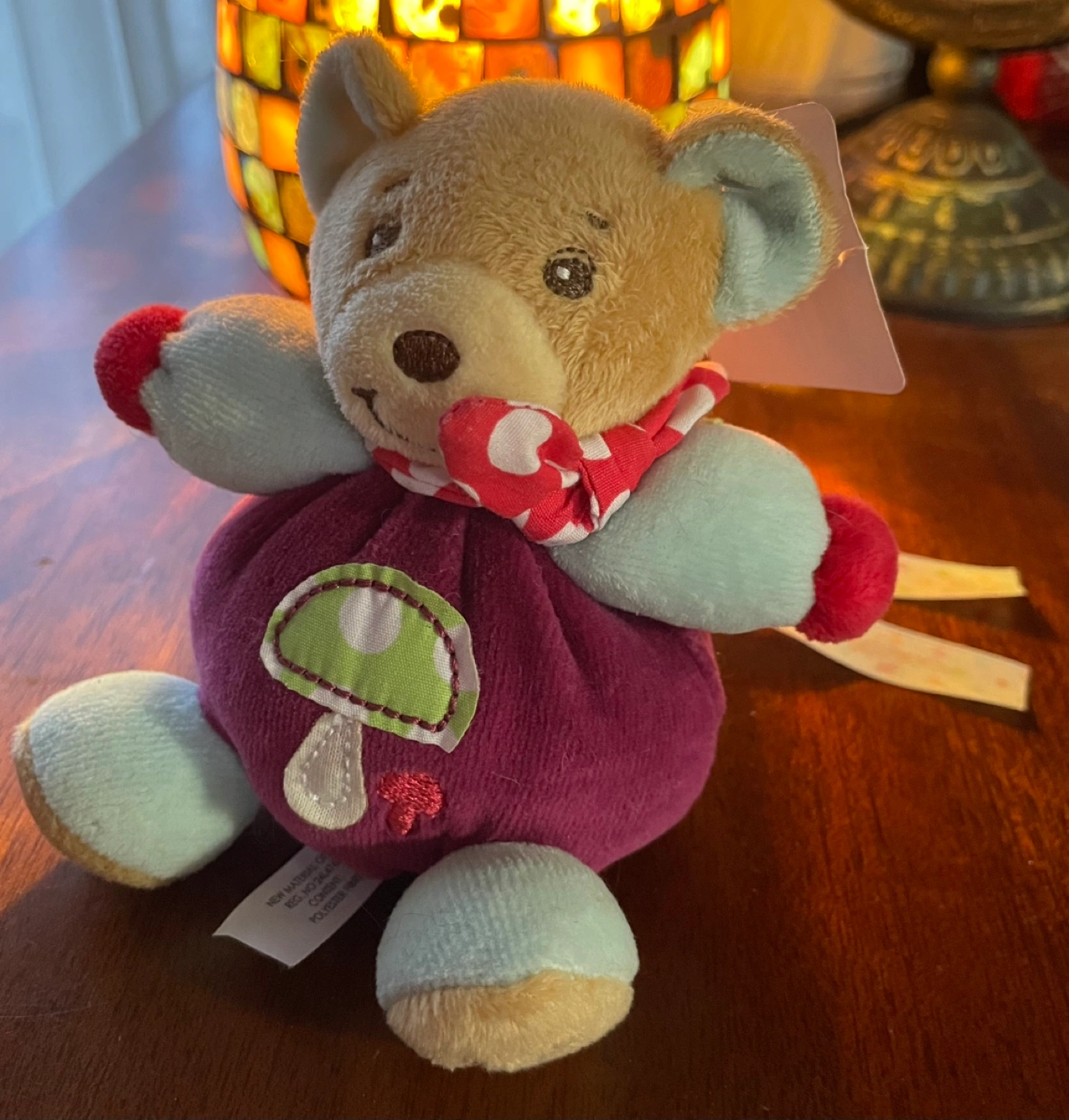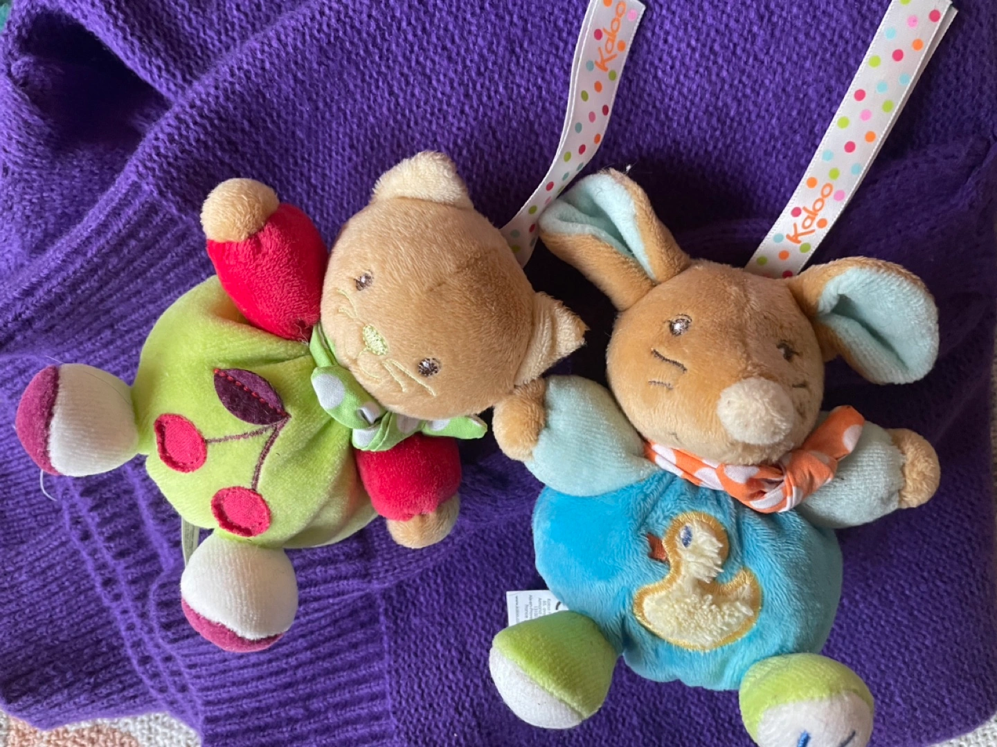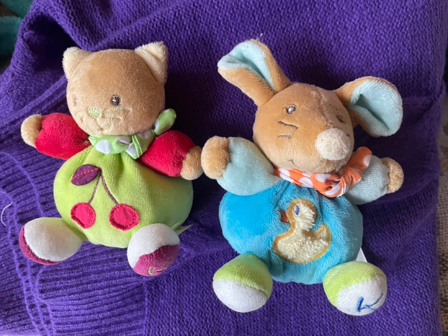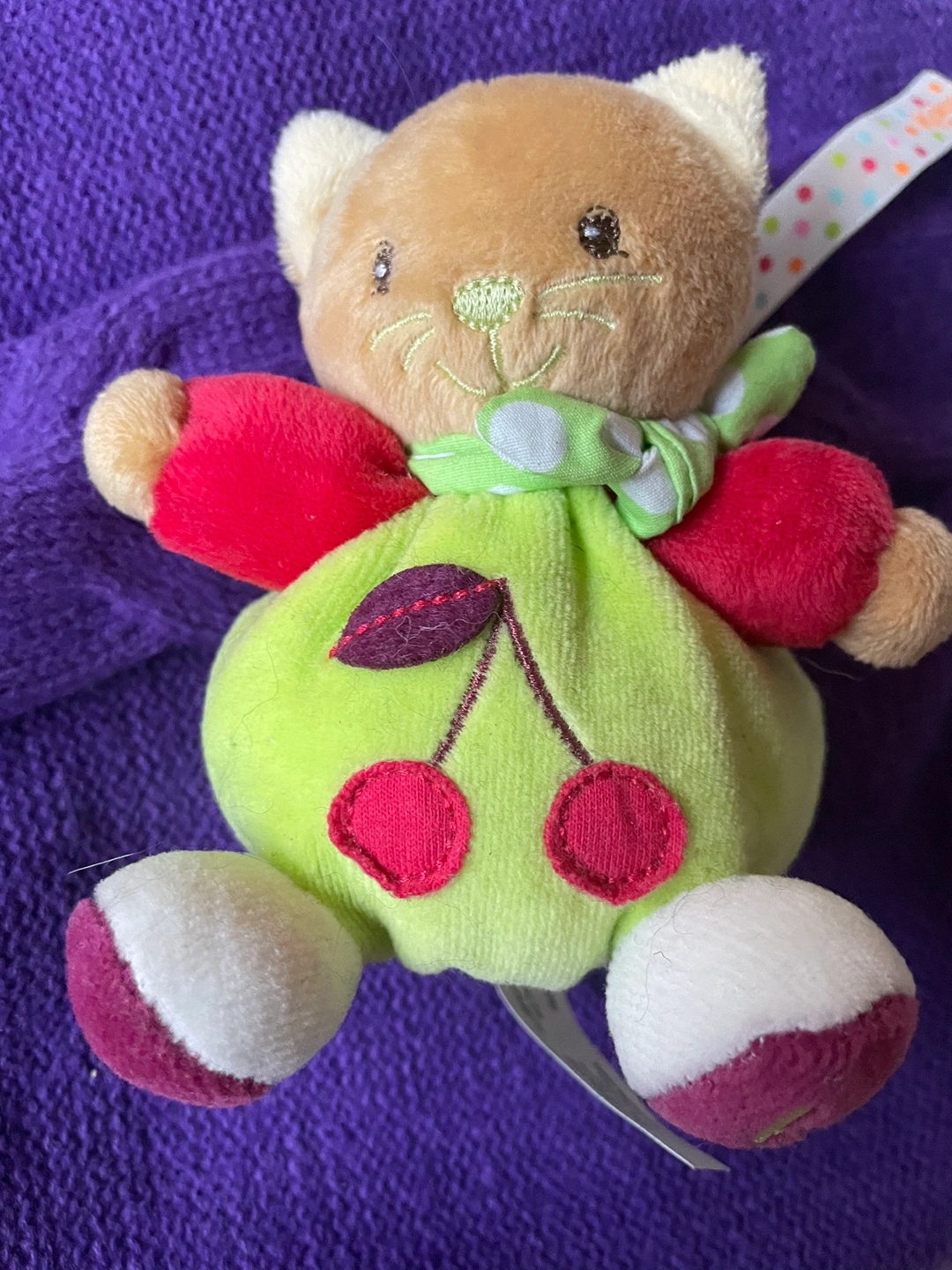 Three plush Kaloo French brand baby toys. One is a cat wearing a cherry-patterned shirt, another is a mouse wearing a duck-patterned shirt and the bear with a cute bandana and mushroom embroidered on his shirt Soft and very squishy nothing dangerous. PU Victoria park ave north Lawrence at Clintwood gate