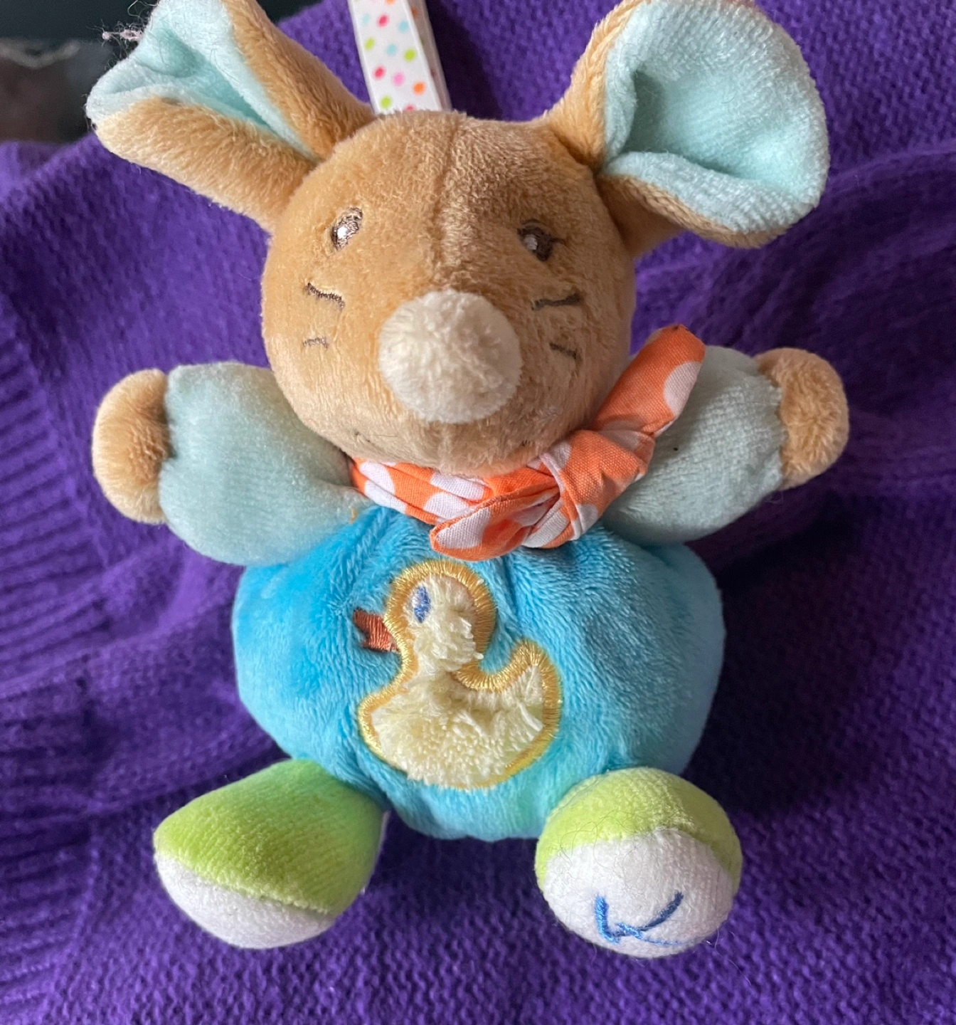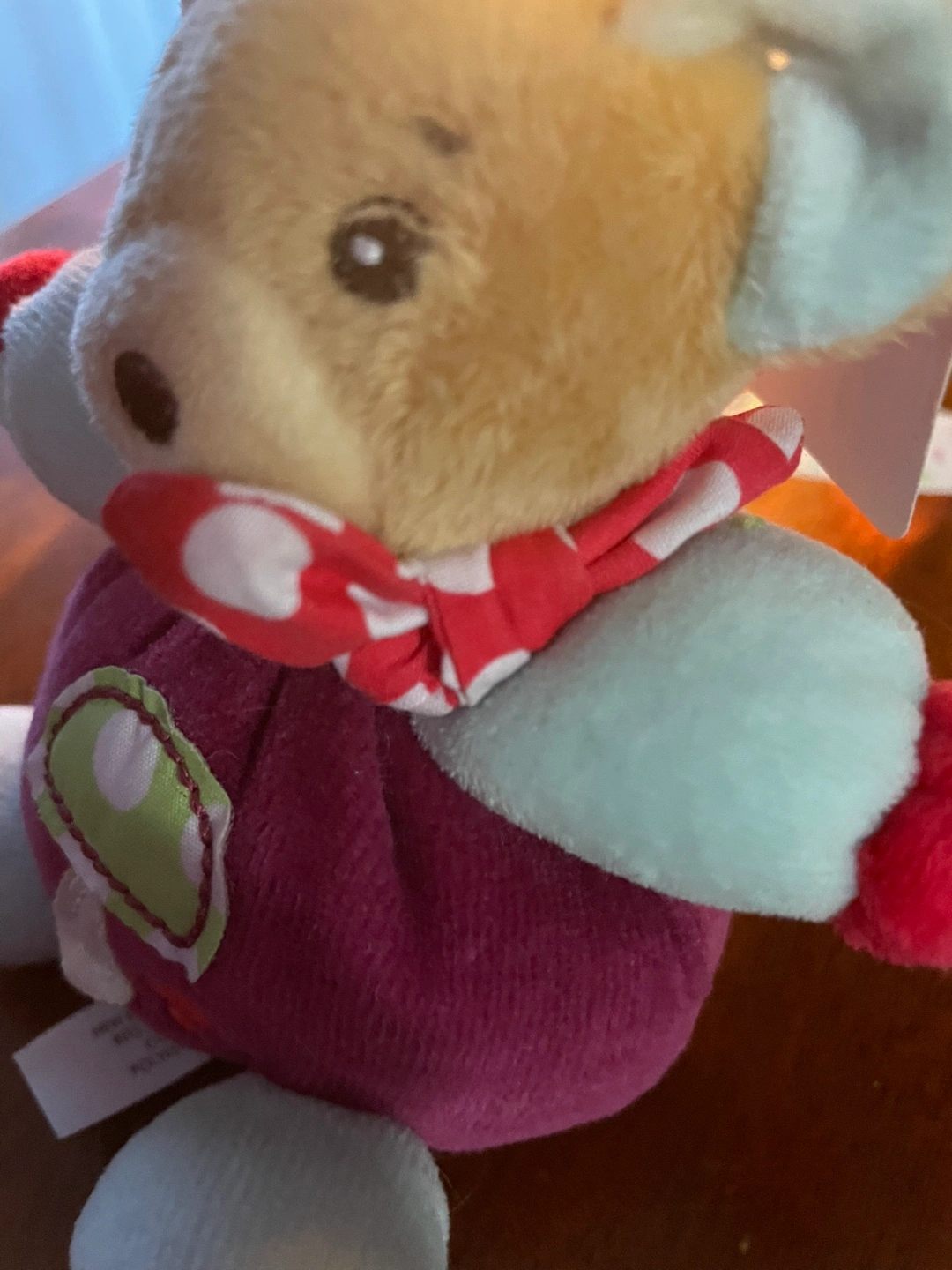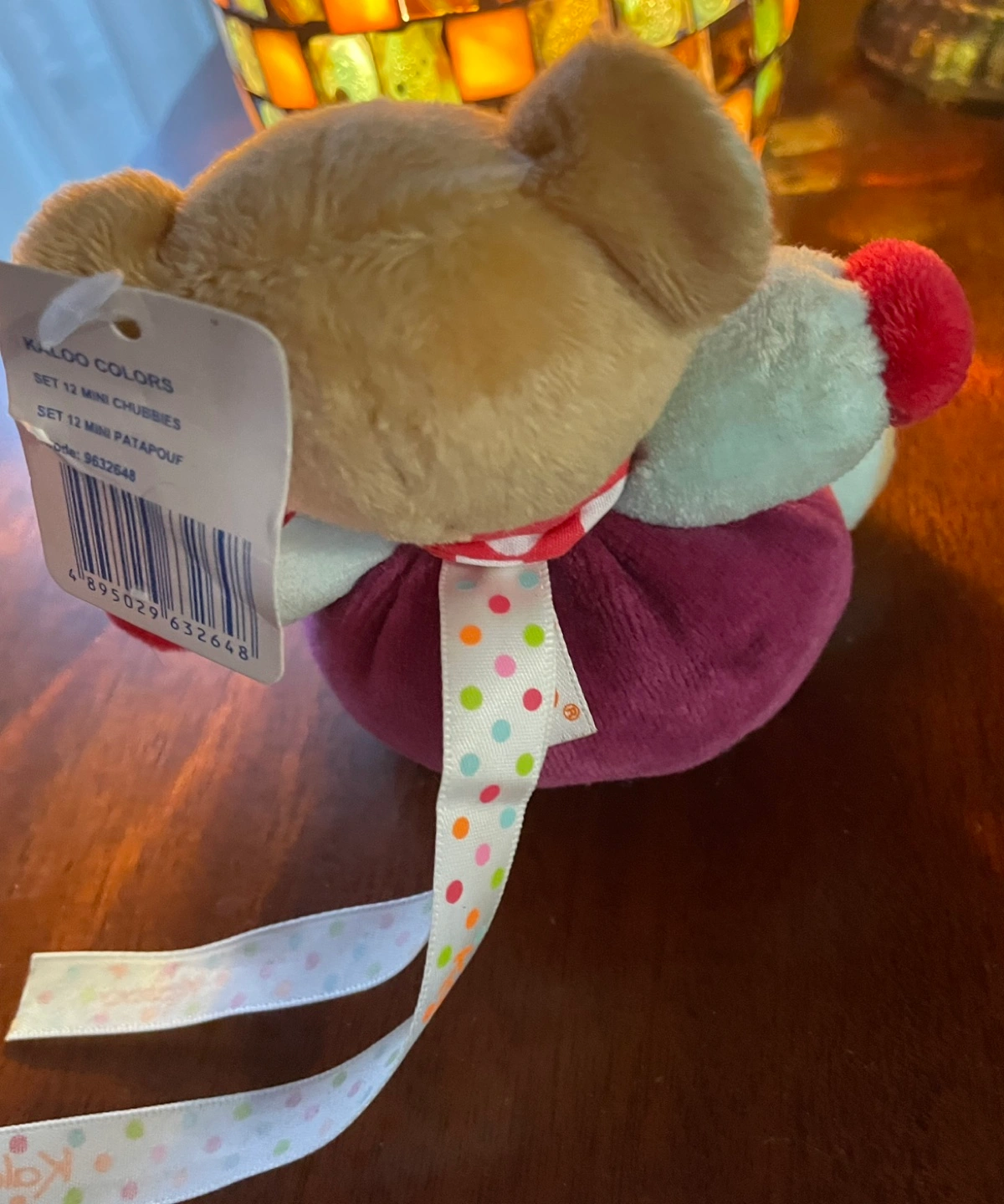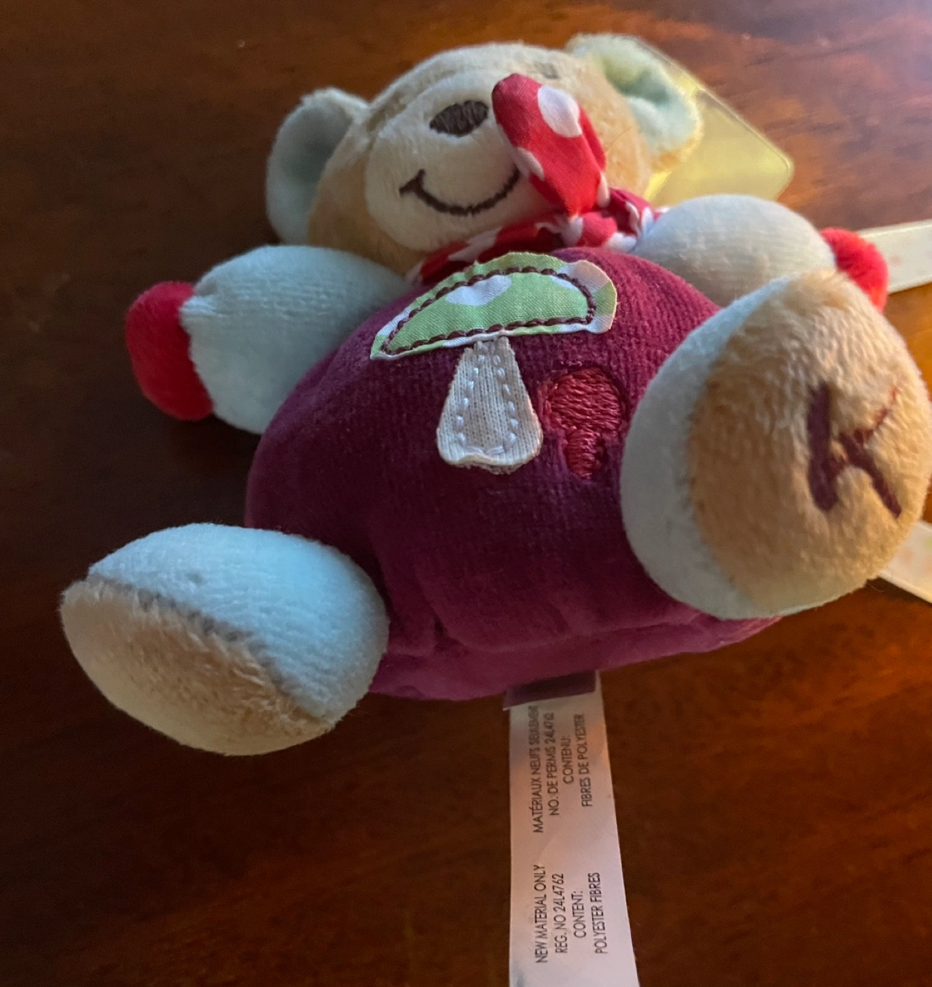 Three plush Kaloo French brand baby toys. One is a cat wearing a cherry-patterned shirt, another is a mouse wearing a duck-patterned shirt and the bear with a cute bandana and mushroom embroidered on his shirt Soft and very squishy nothing dangerous. PU Victoria park ave north Lawrence at Clintwood gate