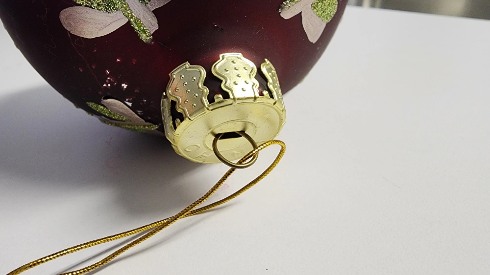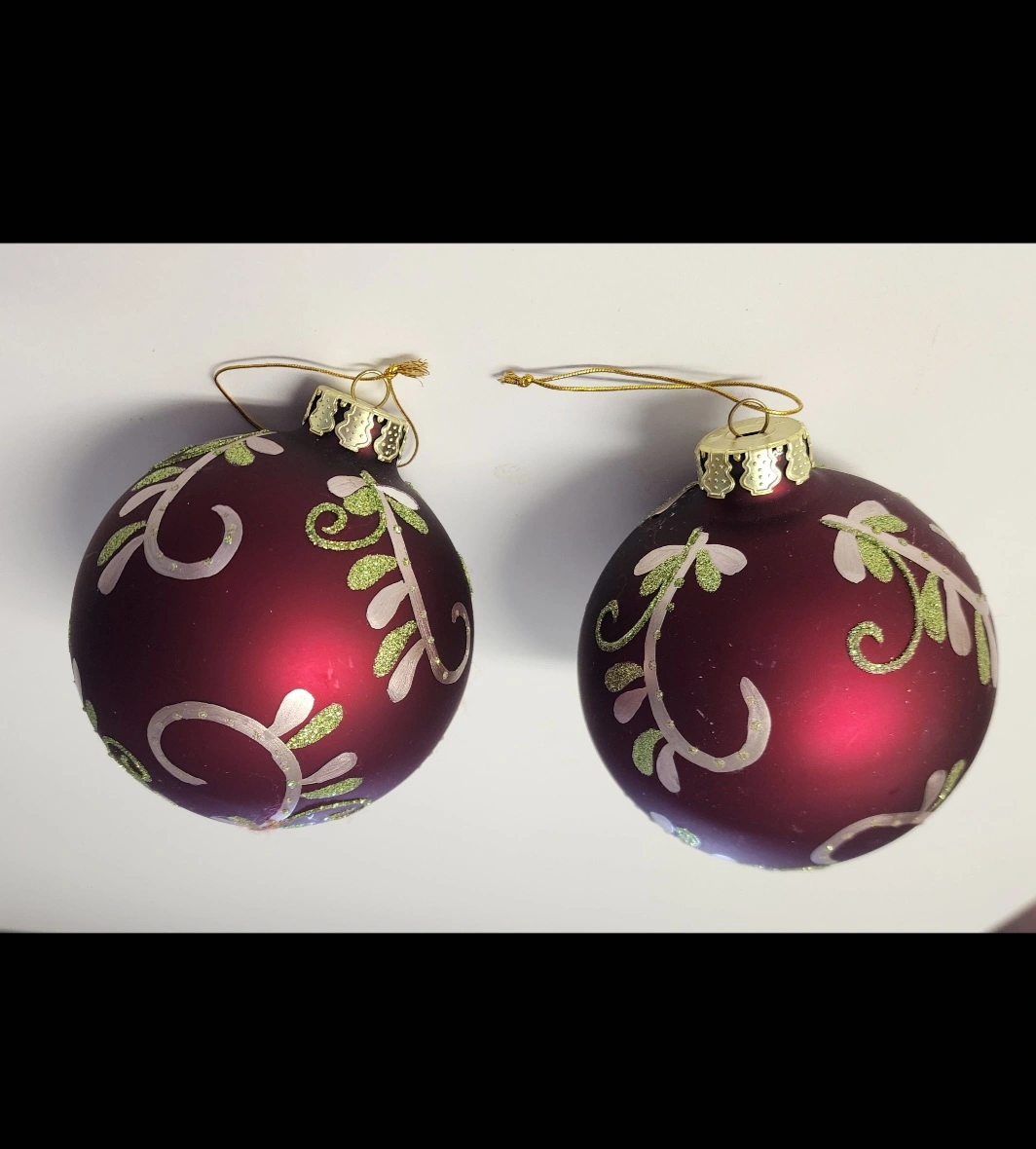 Set of 2 red Christmas ornaments. Meauring 4 inches in diameter, these are larger than typical ball ornaments. Each ornament has gold trim and a green and white hand-painted swirly floral design with a bit of sparkles.