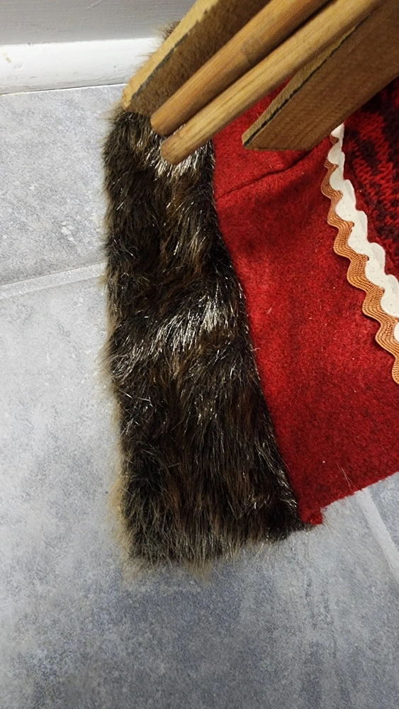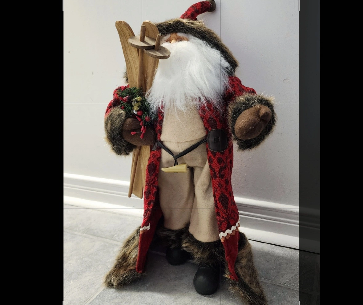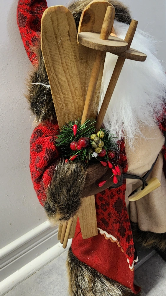 1000+Great condition, no flaws Standing Santa Claus decoration with a red plaid coat and fur trim. His red hat has a metal jingle bell on the end of it. Santa Claus holds wooden skis and poles adding a nostalgic, fun feel. He stands 18" tall with a realistic face, full fluffy beard and brown mittens. Beige overall pants, black boots Approx measurements: Height - 18" Width at arms - 13"