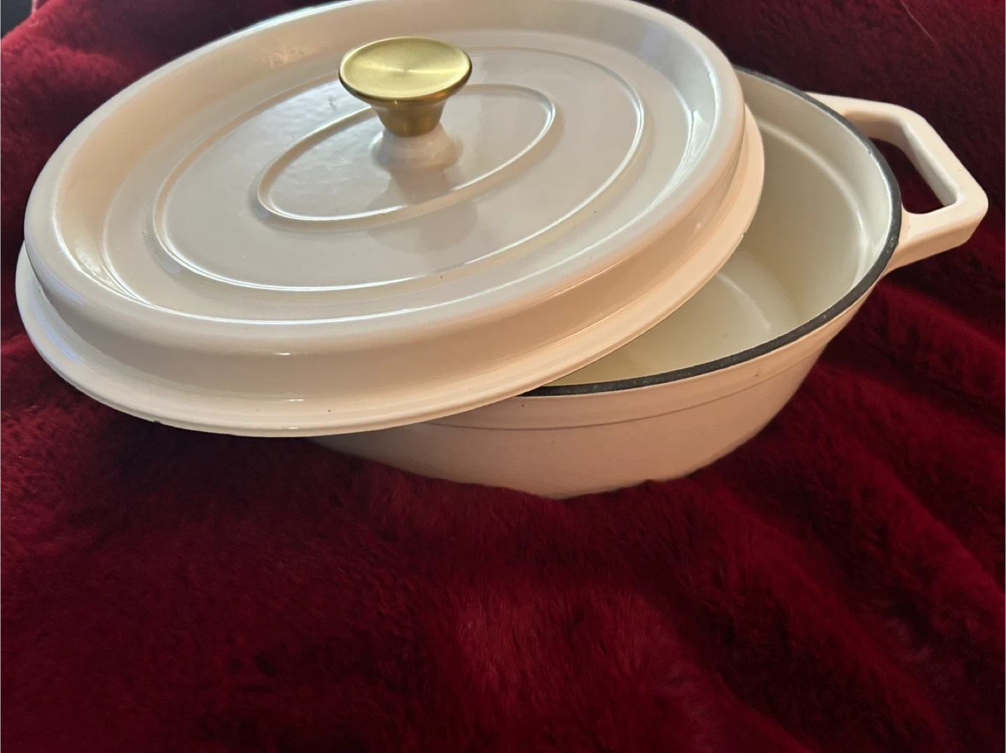 HOUSE& HOME brand- White enamel cast iron Dutch oven with a gold knob. It's great for braising and slow cooking! Huge pretty oval design, think 6 litres. Used just a few times.