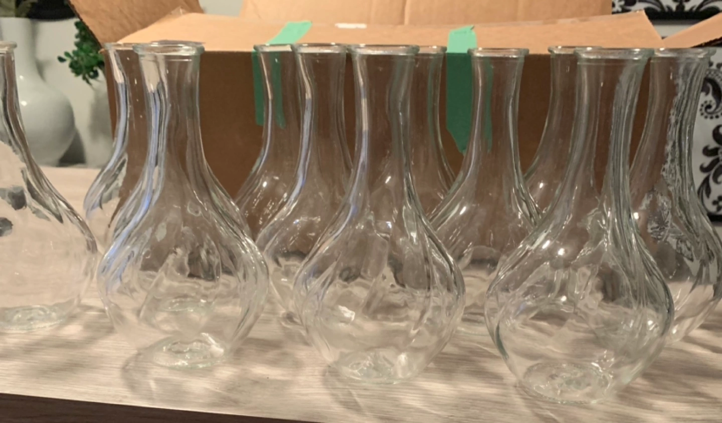 Set of 12 clear glass bud vases. Perfect for home decor or wedding tables.