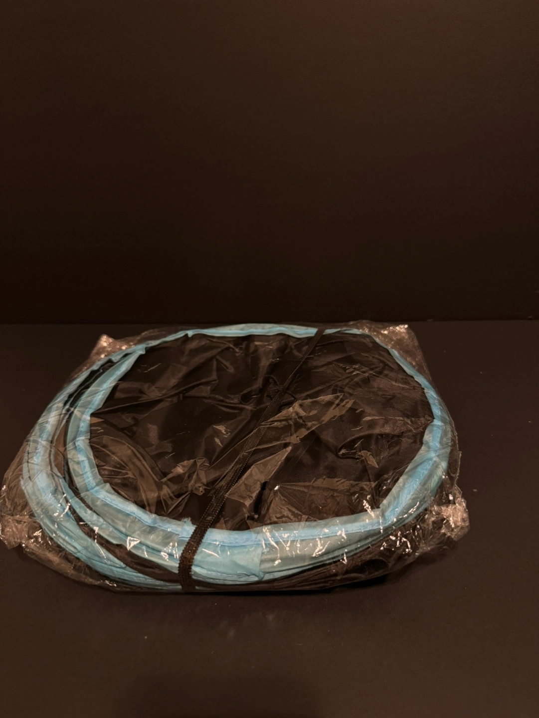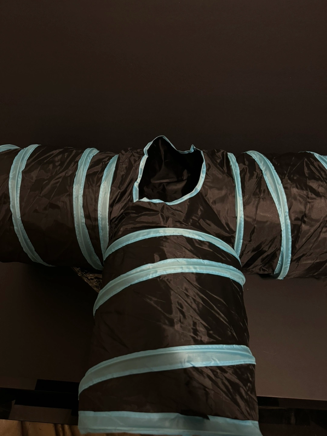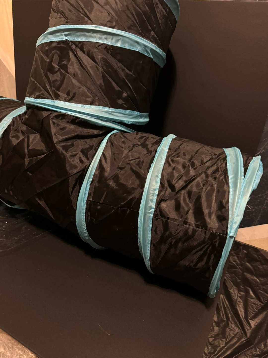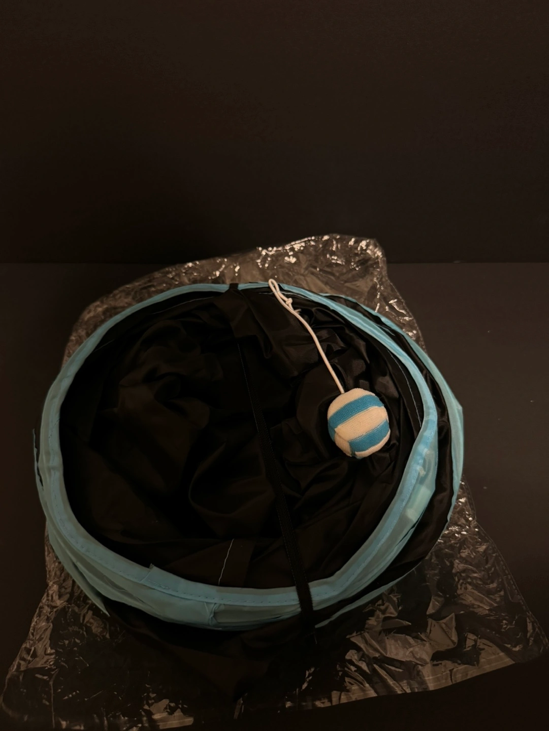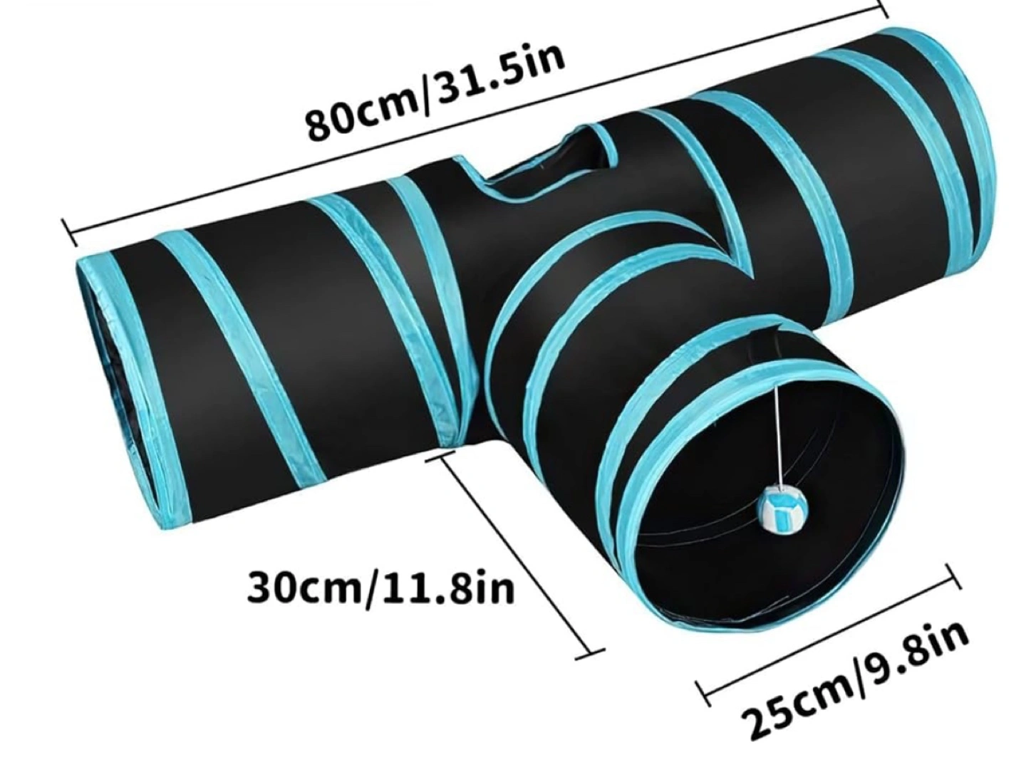 84Collapsible cat tunnel with blue trim. Includes a dangling toy ball.